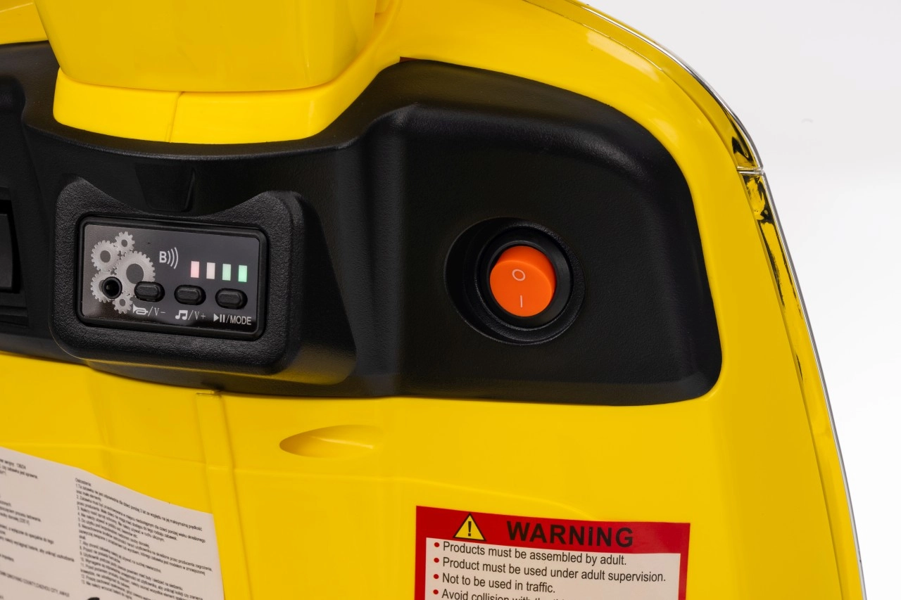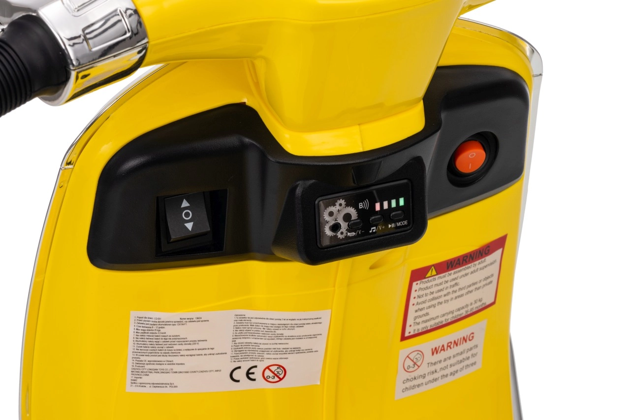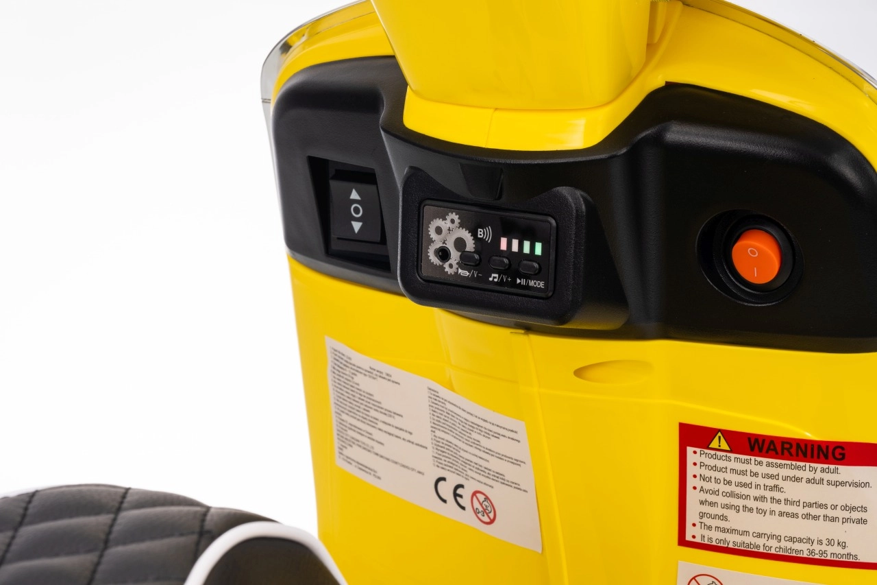 Der stylische elektrische Kinderroller VESPA ROMA in leuchtendem Gelb bietet Kindern sicheren Fahrspaß und erste Fahrerlebnisse. Dank zwei Motoren mit 2×35 W, 12 V 7 Ah Akku, weichen EVA-Rädern und sanftem Anfahren ist die Fahrt komfortabel und stabil. Mit LED-Lichtern vorne und hinten, Audio-Panel mit MP3/Bluetooth/AUX, Ladezustandsanzeige und bequemem Sitz aus Kunstleder. Eine großartige Wahl für kleine Fahrer.