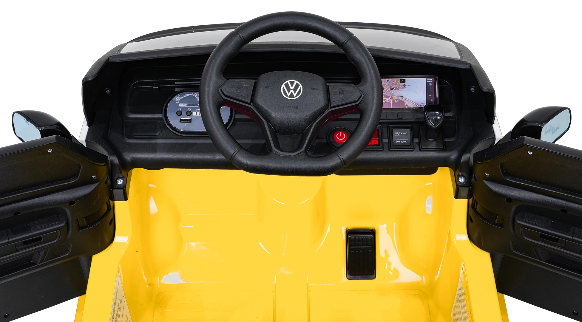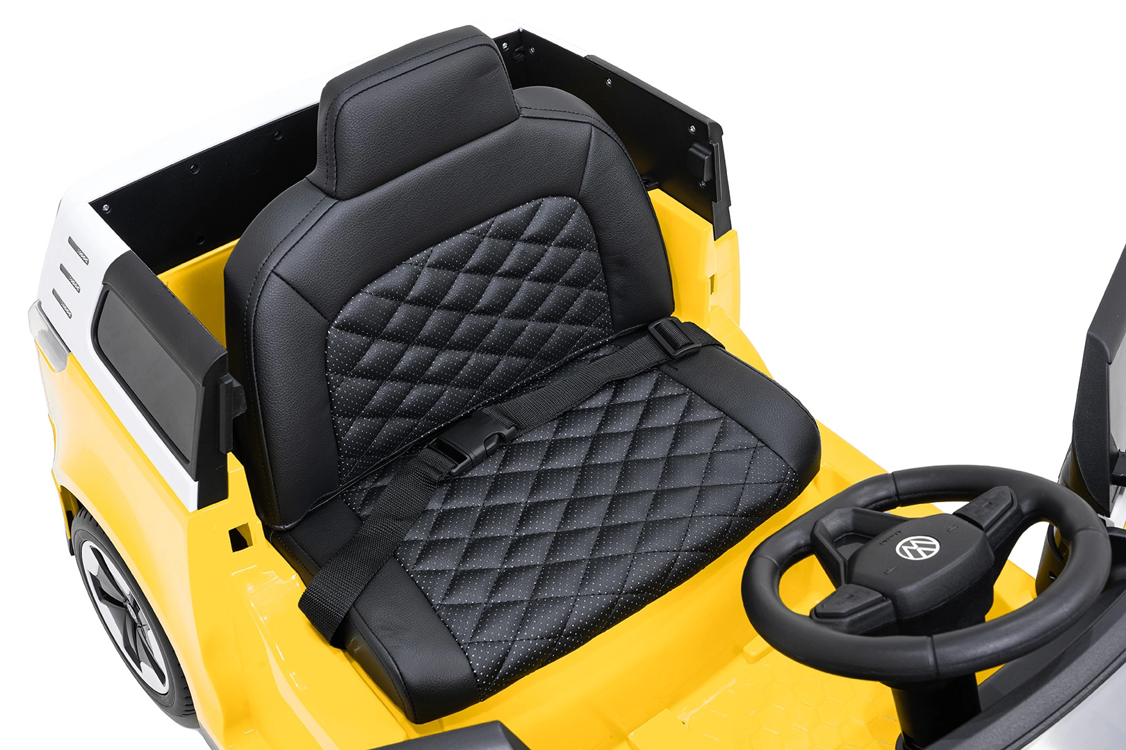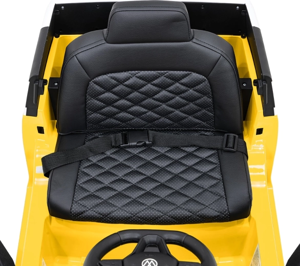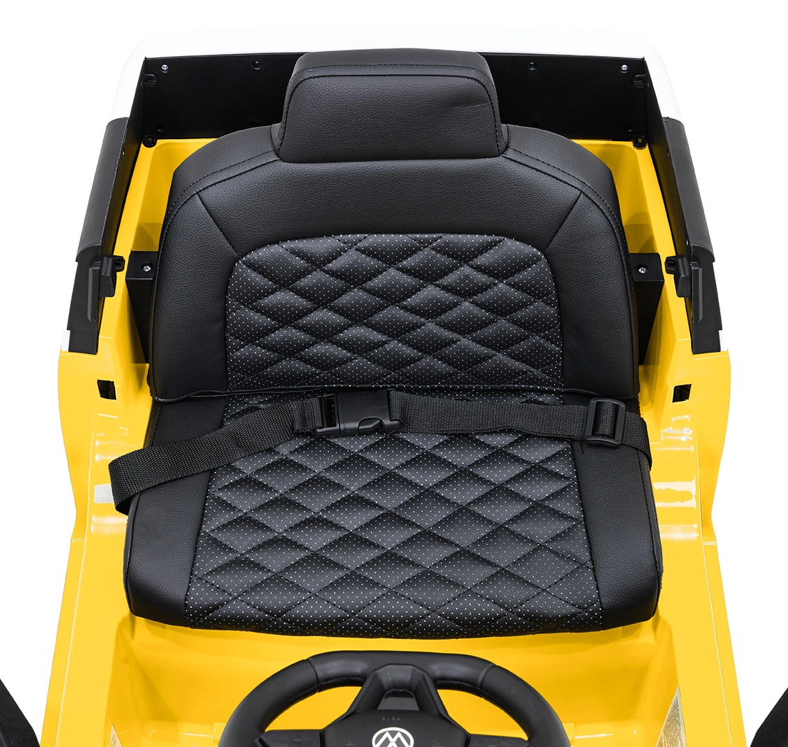 Sicherheit und Komfort stehen an erster Stelle: gepolsterter Sitz aus Eco-Leder mit Sicherheitsgurt, 2,4-GHz-Fernbedienung mit 3 Geschwindigkeiten und Not-Stopp-Taste für die Kontrolle durch Erwachsene. Vordere LED-Lichter und ein Lichtschalter unterstreichen den realistischen Look, öffnende Türen erleichtern das Einsteigen und der hintere Stauraum nimmt Kleinigkeiten für unterwegs auf.