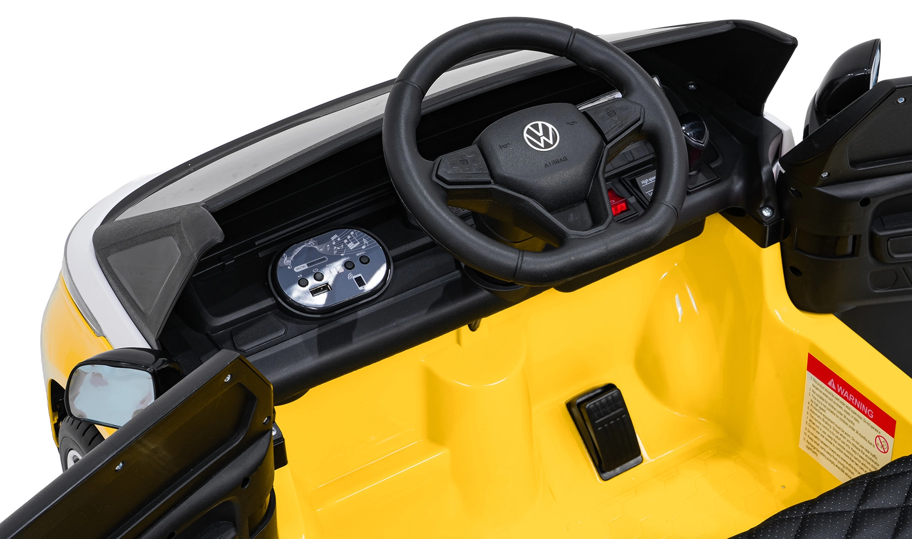 Verbinden Sie Musik über Bluetooth oder USB, nutzen Sie MP3 und vorinstallierte Melodien. Die Bedienung ist übersichtlich und macht kleinen Fahrern Spaß.