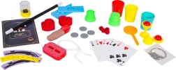 Anleitungen mit 74 Tricks und Codes zu Videos, 5× Karte, Zauberstab, Münzbox, 4× Münze, Becher für Tricks, Würfelbox, Zauberfinger mit Taschentuch, Zauberbecher mit Kugel, Zauberbecher-Set, Zauberherzen, Ring mit Kette, Schnürsenkel, weitere Zauberrequisiten