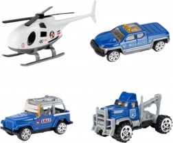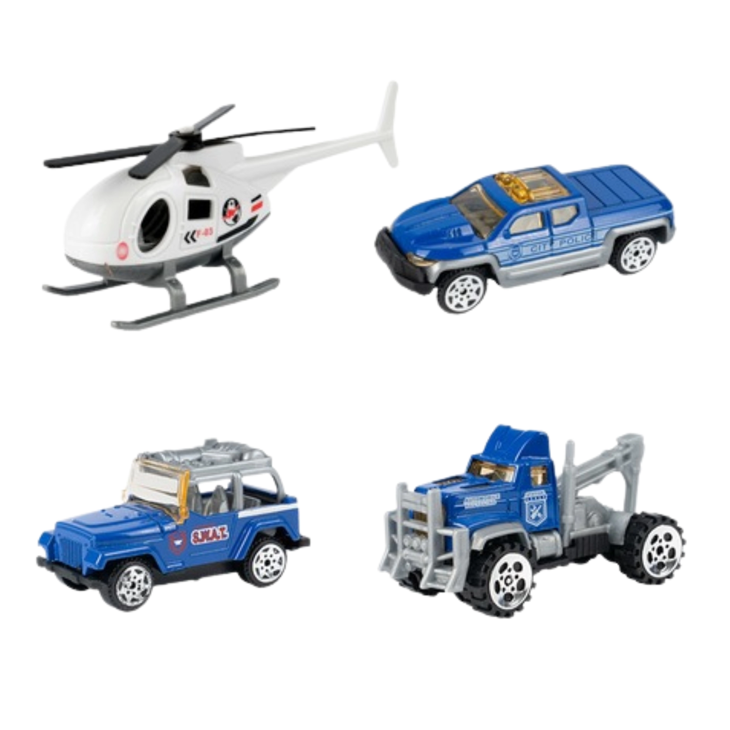 3 Metall-Polizeiautos (zufällige Modelle) + 1 Polizeihubschrauber