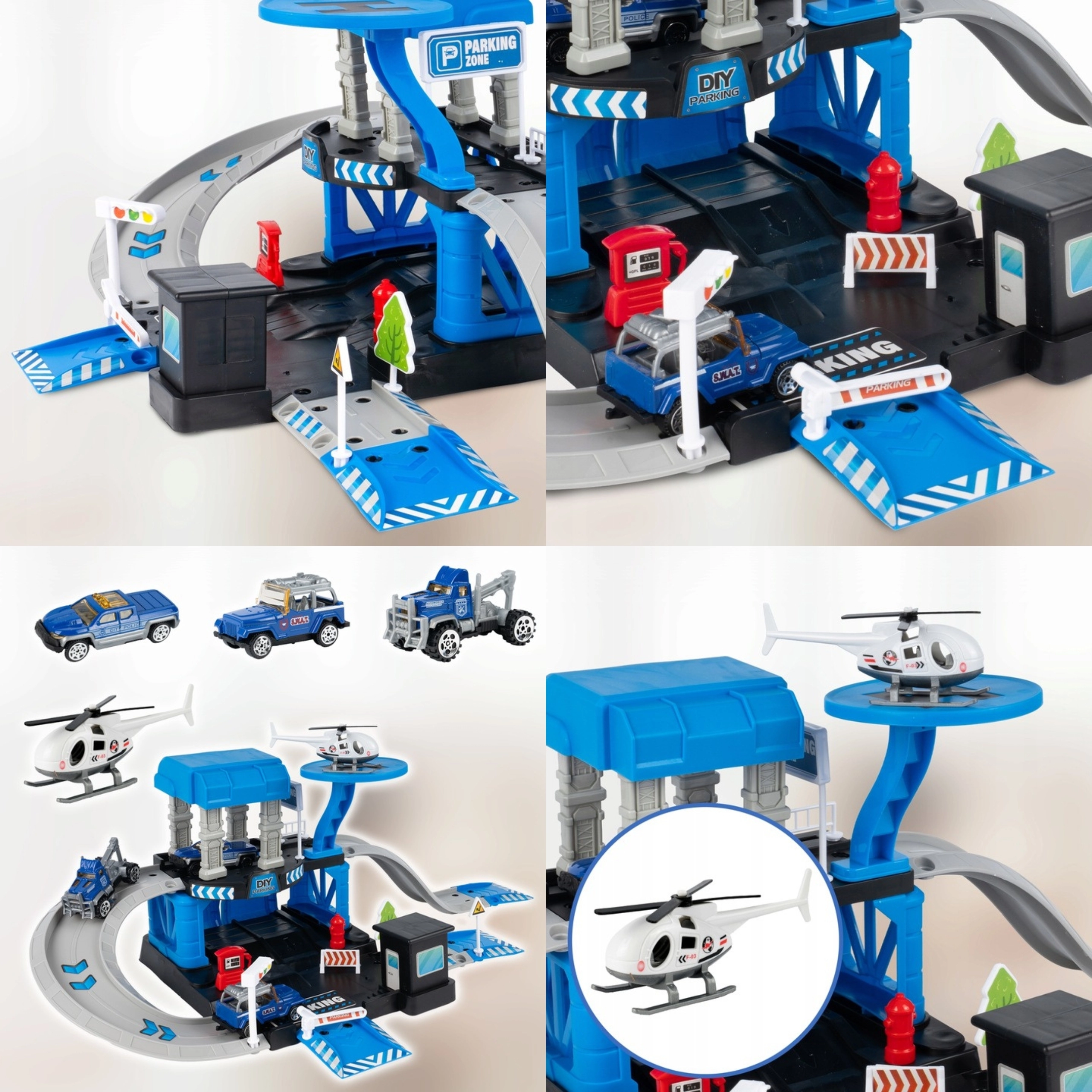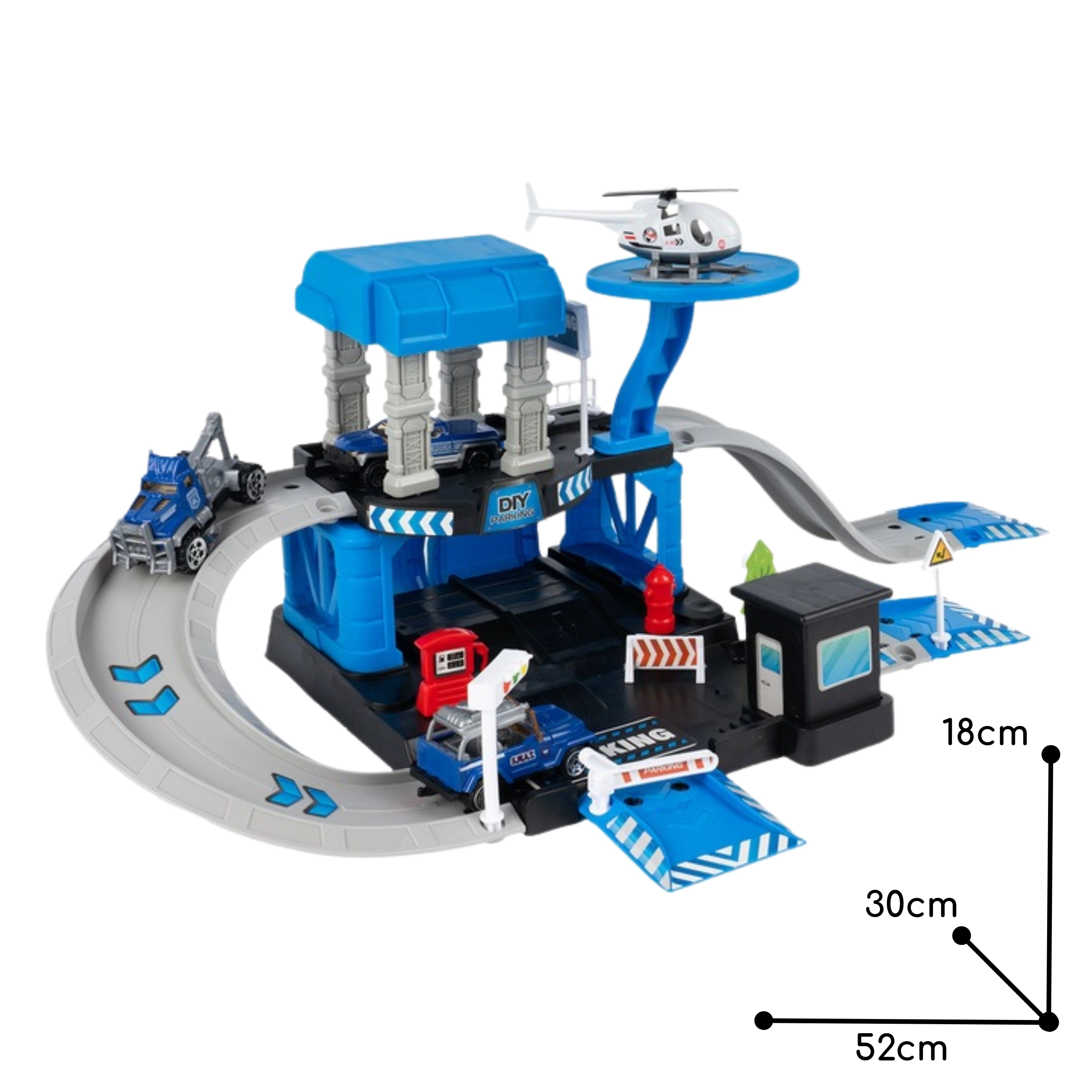 Erschaffe deine eigene Polizeistadt! Dieser zweistöckige Parkhauskomplex mit Kommissariat bietet Rampen, Abfahrten und einen Landeplatz für den Hubschrauber. Dank realistischer Details wie Tankstelle, Schranken, Verkehrszeichen, Ampeln und Wachhäuschen denken sich Kinder im Handumdrehen unzählige Geschichten und Missionen aus.