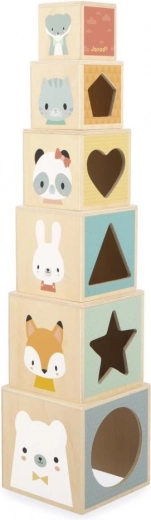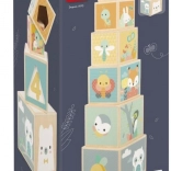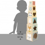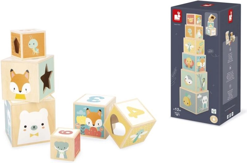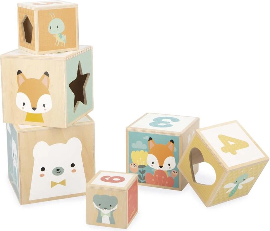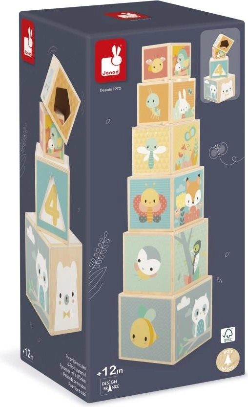 Diese Holzpyramide aus 6 Würfeln begeistert mit zarten Farben und liebevollen Illustrationen. Kinder können die Würfel stapeln, sortieren und kombinieren und verstehen so besser die Prinzipien von Gleichgewicht, Größe und Raum. Jeder Würfel hat 5 unterschiedliche Seiten: ein niedliches Tier, ein Tier in seiner Umgebung, ein kleines Tier auf farbigem Hintergrund, Ziffern für erste Zählübungen und eine ausgestanzte Form, die beim Zusammensetzen zweier Würfel ein fröhliches Bild offenbart (z. B. ein Kätzchen in einem Herz).