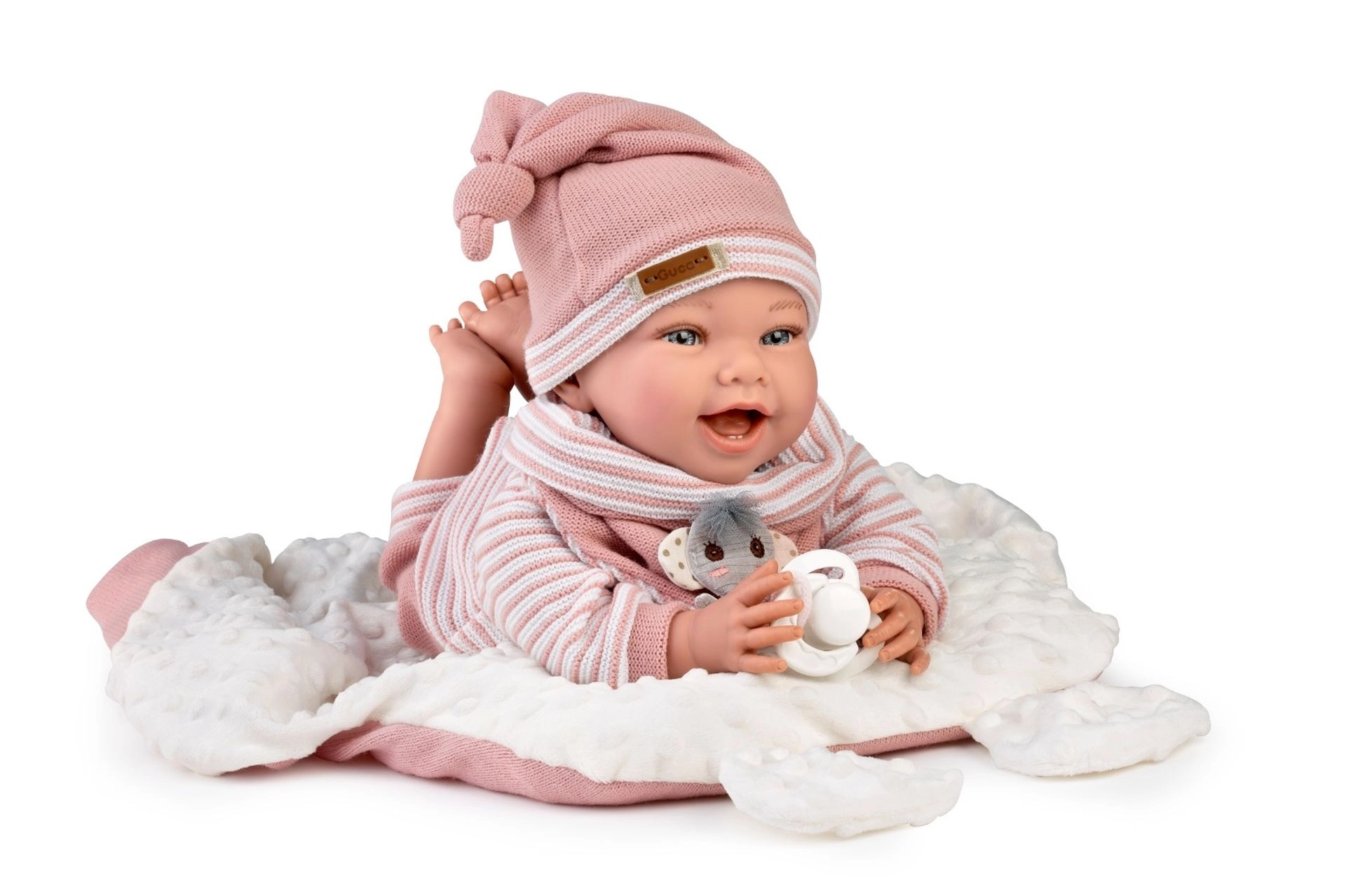 Die Puppe Guca Olivie ist ein gere4uschloses Gewichts-Baby, das dank der gelenkig befestigten Arme und Beine leicht sitzen und Positionen wechseln kann. Die spezielle Ausbalancierung von Kopf und Po (ca. 1.800 g) sorgt ffcr ein authentisches Verhalten im Arm – der Kopf muss wie bei einem echten Baby gestfctzt werden. Der weiche Stoffkf6rper und realistische Details unterstfctzen ein einffchlsames Spiel und die Pflege.