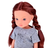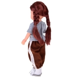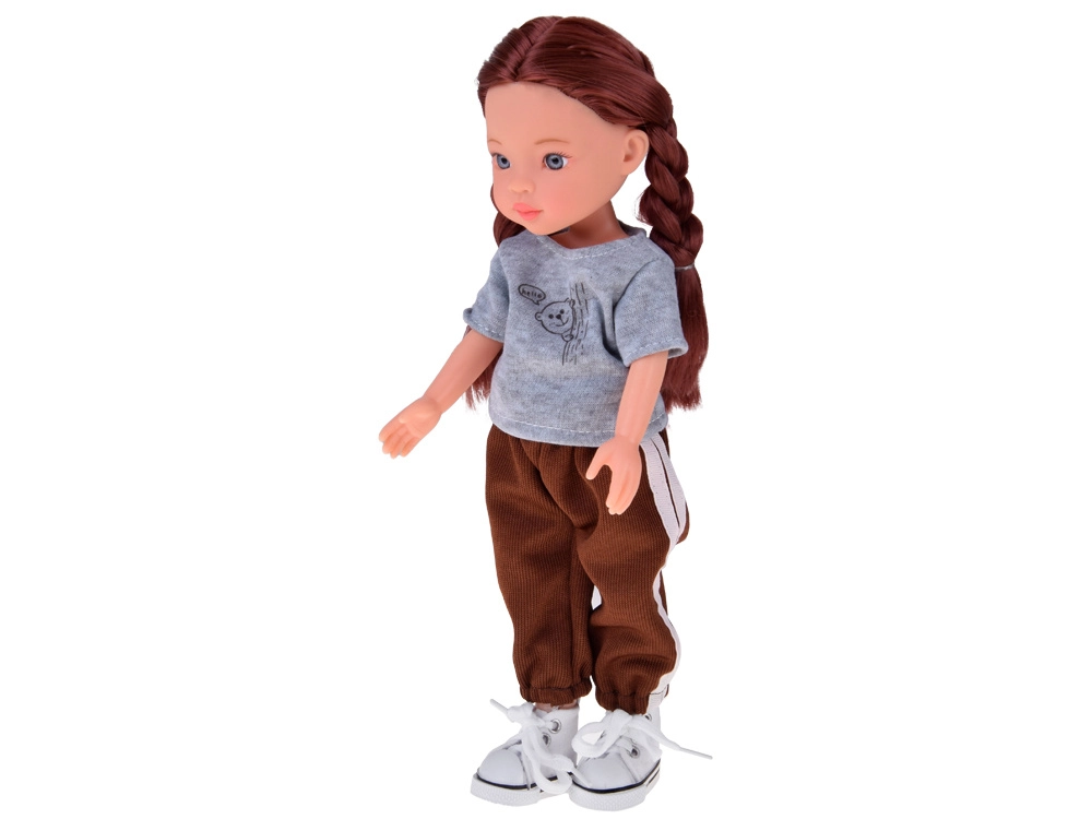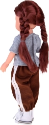Die Puppe mit einer Höhe von ca. 33 cm ist aus hochwertigem Kunststoff gefertigt und dank artikulierten Armen, Beinen und Kopf leicht zu positionieren. Die langen, dichten satinierten Haare laden zum Kämmen, Flechten und Stylen ein. Ein lässiges graues T‑Shirt mit Print, braune Jogginghose mit weißen Seitenstreifen und weiße Sneaker runden den modernen sportlichen Look ab.