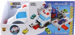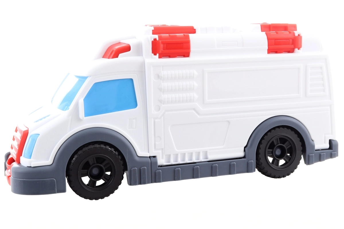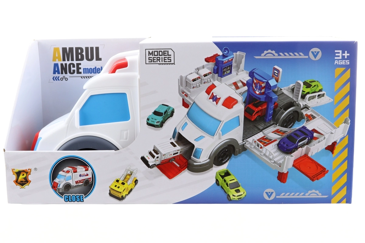 Das Spielzeug besteht aus robustem Kunststoff, hat praktische Maße für das Spielen zu Hause und unterwegs und im Set sind zusätzlich 2 kleine Rettungsautos enthalten, die noch mehr Spielmöglichkeiten bieten.