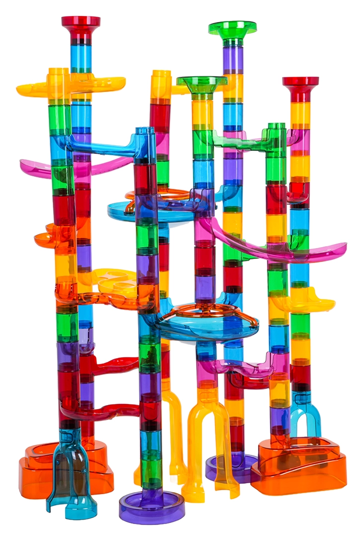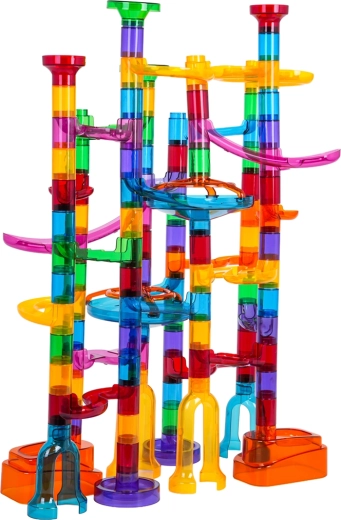 Robuste, transparente Komponenten in leuchtenden Farben sorgen für Stabilität der gesamten Bahn und für tolle optische Effekte beim Rollen der Murmeln.