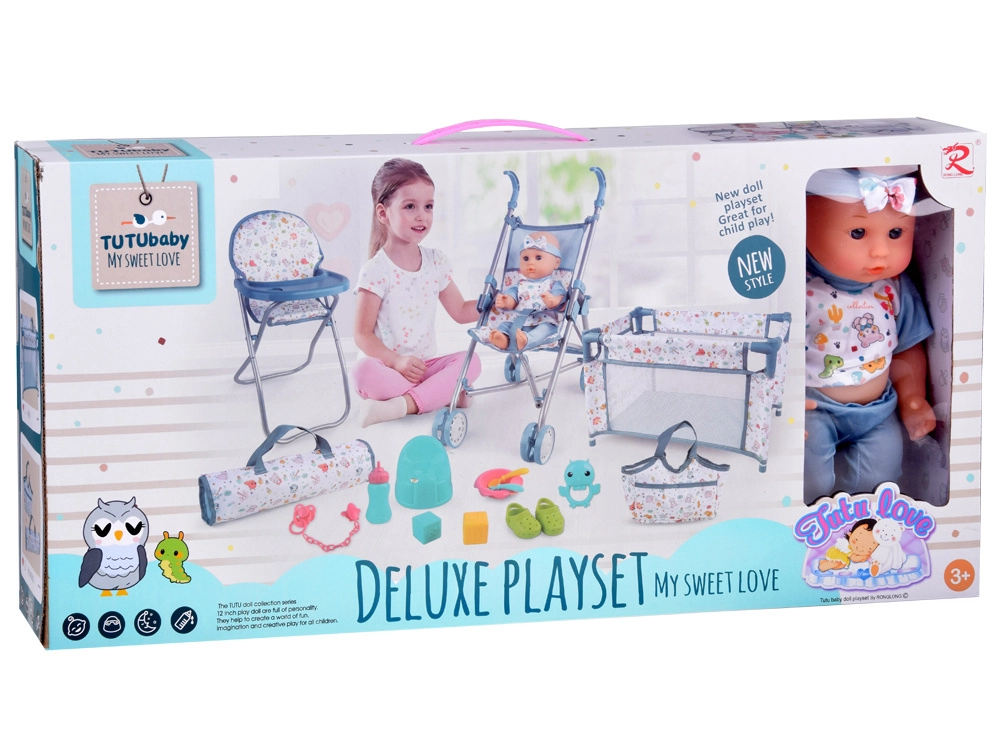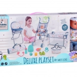 Deluxe-Set Babypuppe mit Kinderwagen, Reisebett, Hochstuhl und Zubehör