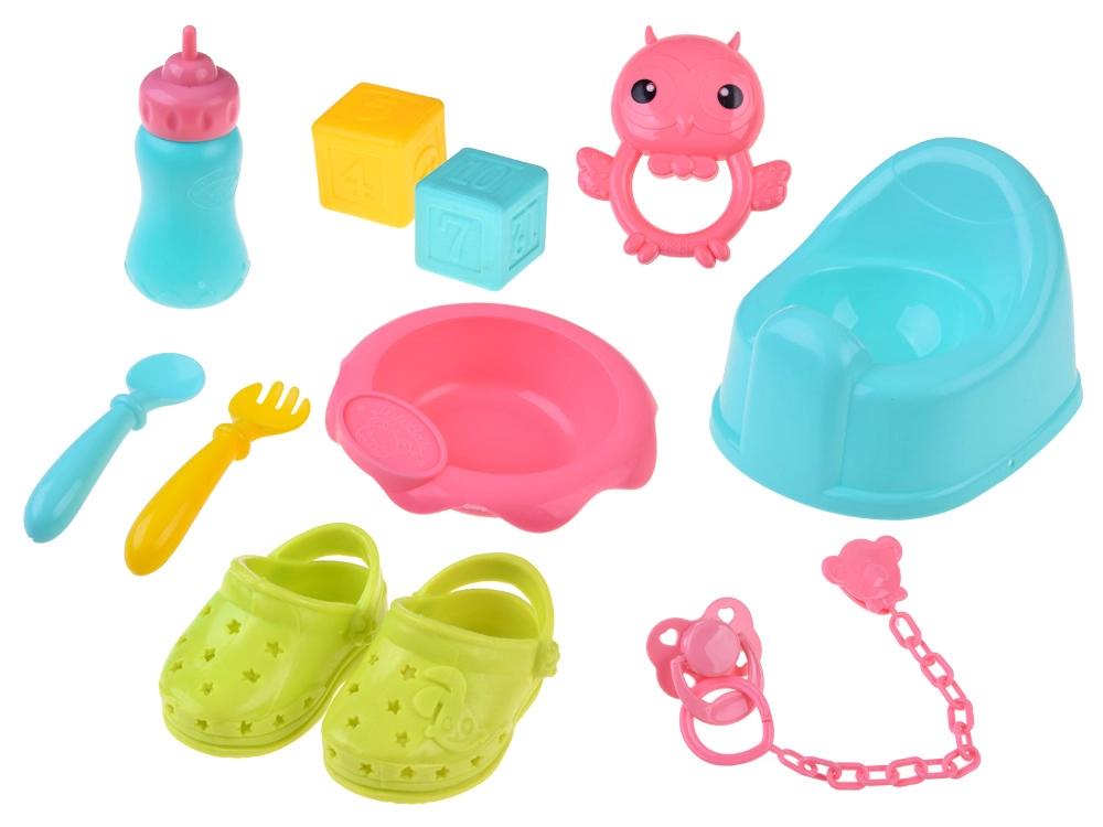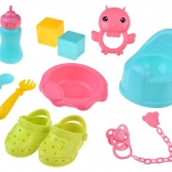 Die praktische Ausstattung umfasst ein Ess-Set (Schüssel, Besteck und Fläschchen), ein Töpfchen, einen Schnuller mit Kette, bunte Bausteine und eine Rassel. Das Reisebett mit atmungsaktiven Netzseiten und Tasche ist ideal zum Spielen und Aufbewahren. Dank des umfangreichen Zubehörs können Kinder echte Babypflege spielend nachahmen und Kommunikation sowie Feinmotorik fördern.