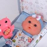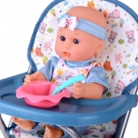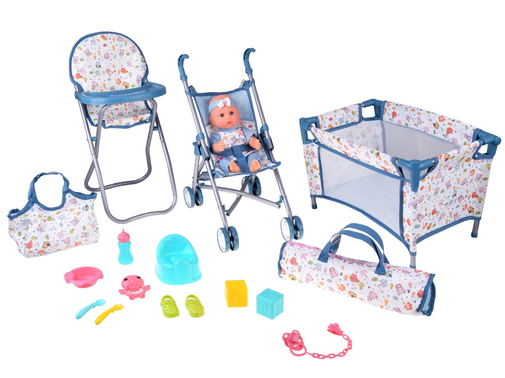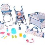 Set für Puppe – Babypuppe mit Kinderwagen, Reisebett, Hochstuhl und Zubehör