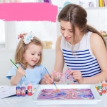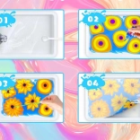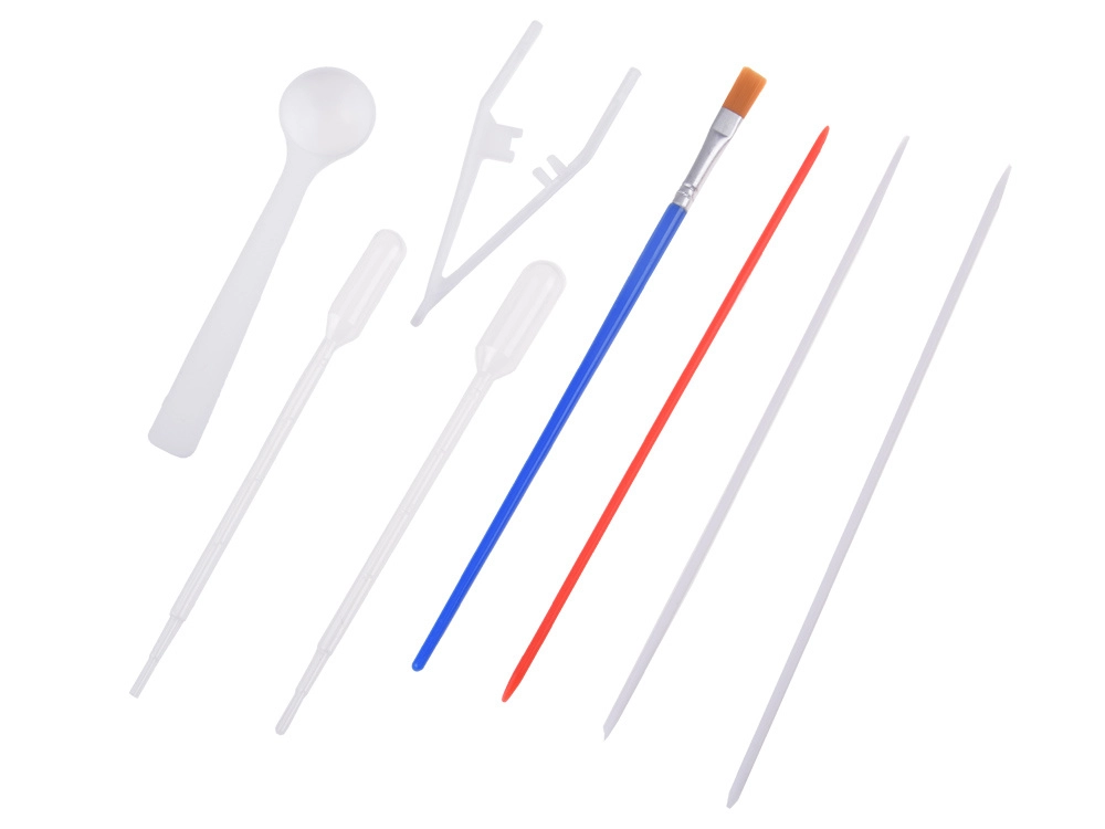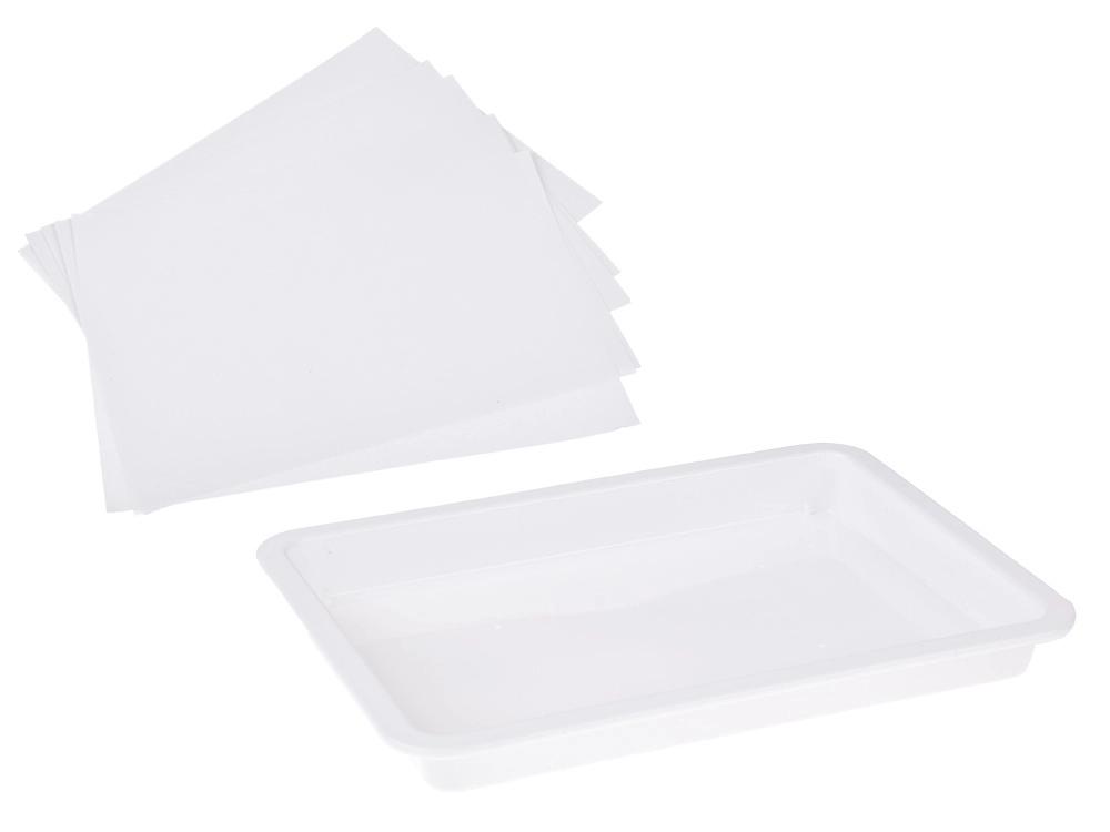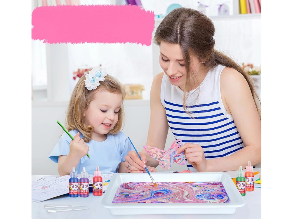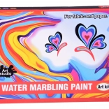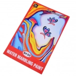 Im Set ist alles enthalten: 12 Farbfläschchen (16 ml) mit präziser Spitze, eine Kunststoffwanne, Papiere sowie ein Werkzeugsatz (Pipetten, Kamm, Pinsel, Spachtel u. a.). Nach dem Mischen des Pulvers mit Wasser entsteht ein gelartiges Bad, in das Sie die Farben tropfen und das Muster formen – dieses wird anschließend einfach auf Papier abgedruckt.