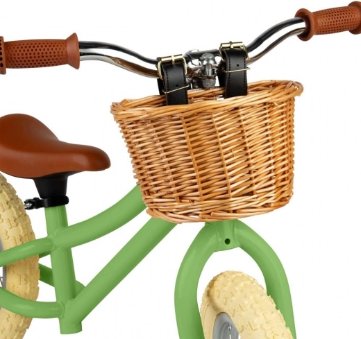 Eleganter Weidenkorb am Lenker für Kleinigkeiten und Spielzeug. Braune Griffe und Sattel verleihen dem Laufrad einen zeitlosen Look.