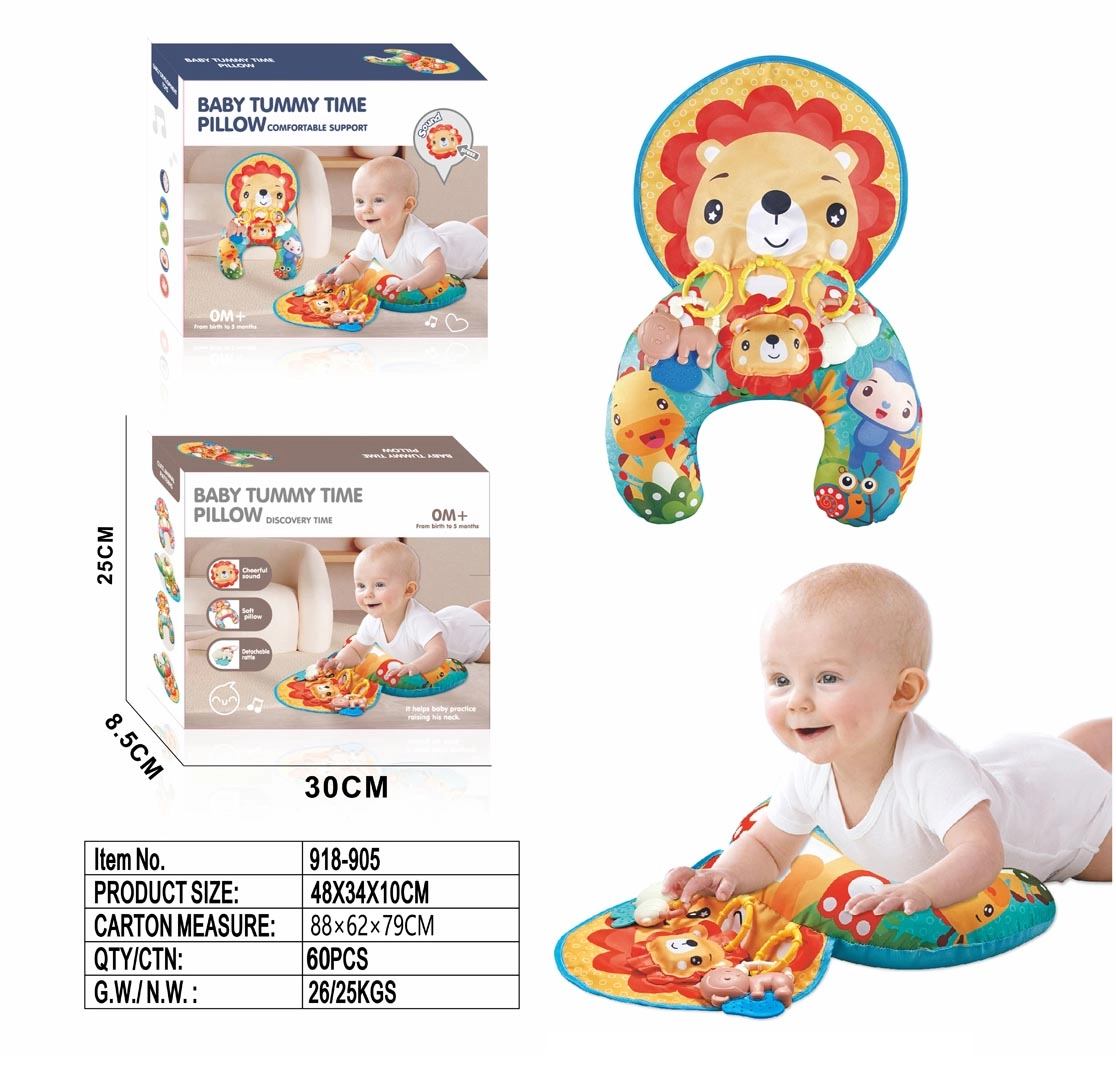 Zum Set gehören drei abnehmbare Spielzeuge, die sich auch am Babybett oder Kinderwagen befestigen lassen. Der Anhänger mit Bär und Pilz hat einen Beißring und eine Rassel, der Anhänger mit dem Löwen enthält eine Quietsche. Dank der Vielseitigkeit und der weichen Füllung ist das Kissen der ideale Begleiter zum Spielen, Ausruhen und Reisen.