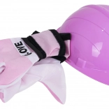 Zum Set gehören ein rosafarbener Helm und weiche Handschuhe für sicheres und realistischeres Spielen kleiner Handwerkerinnen und Handwerker.