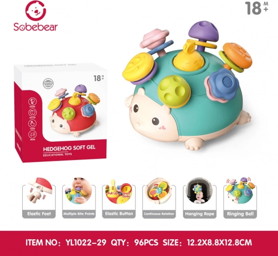 Die sanften Noppen mit unterschiedlichen Oberflächen sind beim Zahnen sehr hilfreich. Unter den Noppen sind bunte Ringe versteckt, die beim Schütteln angenehm rasseln. Der mittlere Noppen lässt sich drücken und ziehen, um Fingerkraft zu trainieren; Ärmchen und Beinchen sind mit einem elastischen Gummiband befestigt und laden zum Ziehen ein. Die Unterseite wird durch einen Spinner für zusätzlichen Spielspaß und Koordinationstraining ergänzt. Dank der praktischen Schnur kann der Igel leicht am Bettchen oder Wickeltisch aufgehängt werden.