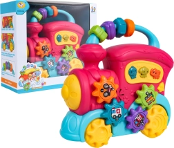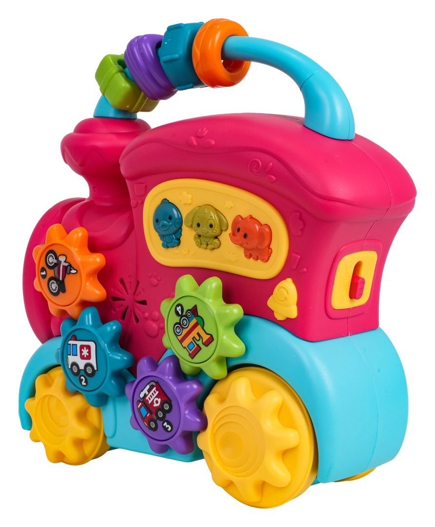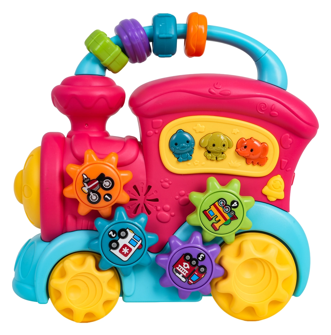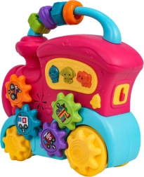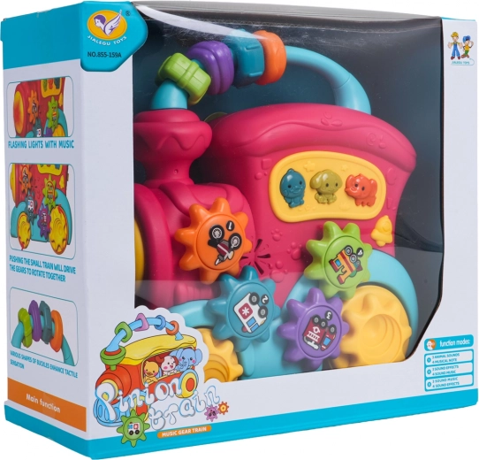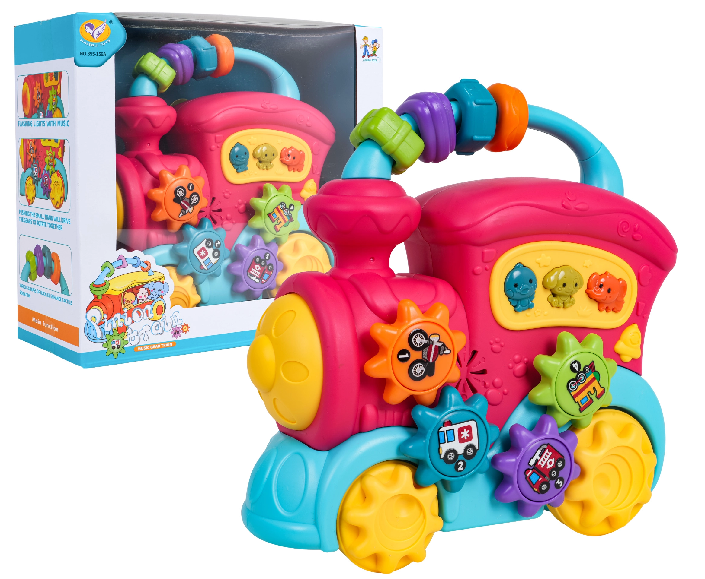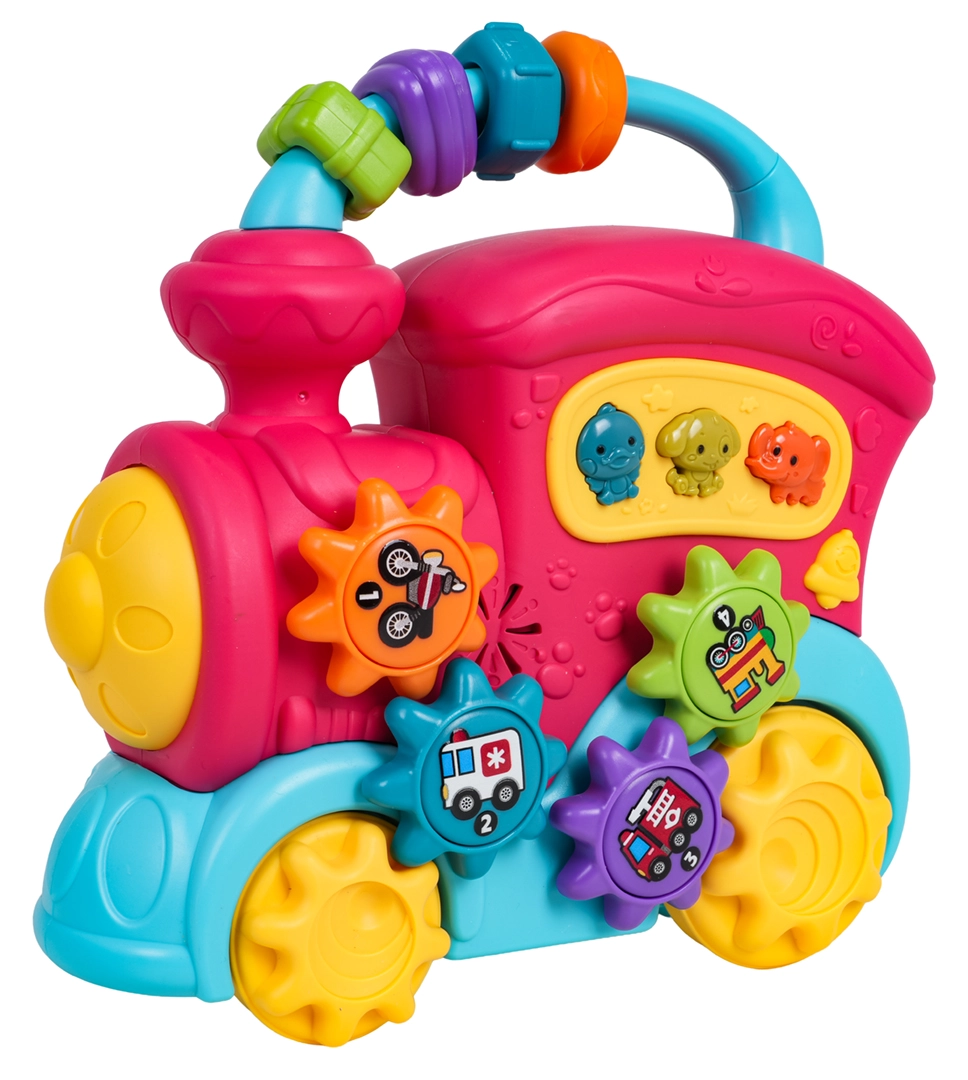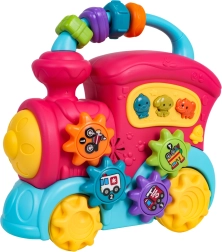 Dieser farbenfrohe Zug aus hochwertigem Kunststoff begeistert kleine Entdecker mit zahlreichen interaktiven Elementen. Auf dem Dach befinden sich sensorische Perlen, an der Seite Zahnräder mit Bildern und Tasten mit Tiermotiven, die beim Drücken Geräusche von Ente, Hund oder Elefant, fröhliche Klingeln und Melodien abspielen. Beim Bewegen des Zugs drehen sich die Räder, der Zahnradmechanismus erzeugt ein angenehmes Rasseln, der vordere Scheinwerfer leuchtet auf und das Kind wird zu weiterem Erkunden motiviert.