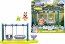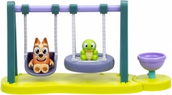 Dieses farbenfrohe Mini-Spielset mit Schaukeln begeistert alle kleinen Fans von BLUEY. Zwei funktionierende Schaukeln und eine Drehschüssel/ein Karussell laden zu endlosen Spielplatzgeschichten ein. Kinder können Bingo und das Schildkrötchen platzieren, vor- und zurückschaukeln und sie dann so lange drehen, bis sich vor Freude alles dreht.