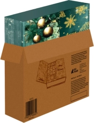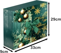 Robuster laminierter Karton in grün-goldener Kombination und ein Stoffband machen ihn zu einem dekorativen Element der Weihnachtszeit. Sieht großartig unter dem Baum und auf der Kommode aus.