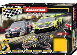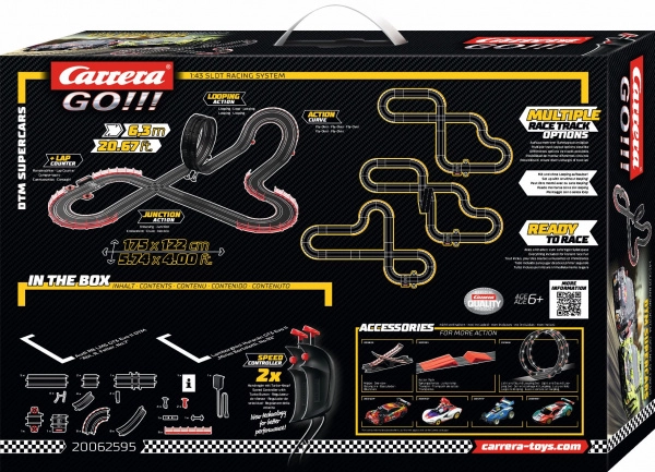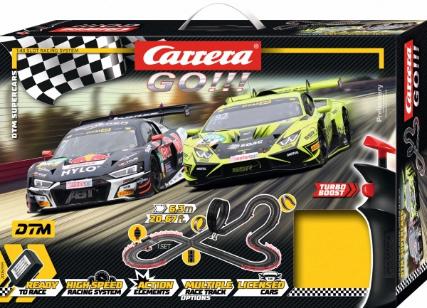 Die CARRERA GO Autorennbahn im Maßstab 1:43 bringt Adrenalin direkt ins Wohnzimmer. Bauen Sie eine 6,3 m lange Strecke mit den Aufbaumaßen 175 × 122 cm und genießen Sie dynamische Duelle der ikonischen GT3-Spezialisten Audi R8 LMS und Lamborghini Huracán. Dank der durchdachten Konstruktion lässt sich die Bahn leicht auf- und abbauen und bietet viele mögliche Konfigurationen.