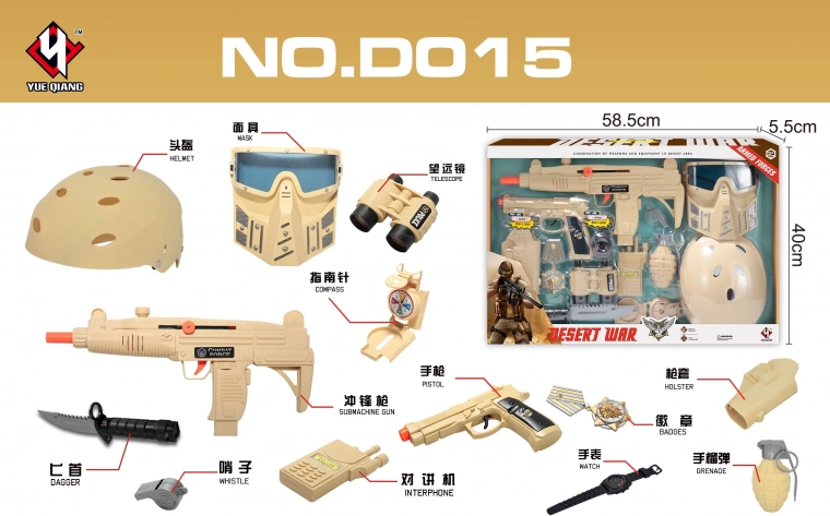Dieses sandfarbene Soldaten-Set begeistert kleine Abenteurer. Kinder freuen sich über realistische Accessoires, mit denen sie sich wie auf einer echten Mission fühlen – von Helm und Weste bis hin zu Kompass und Funkgerät. Das Gewehr funktioniert manuell (nach dem Verschieben des orangen Rings nach rechts und Drücken des Abzugs ertönt ein Schussgeräusch) und die Pistole wird mit 3× AG13 betrieben (Batterien sind im Lieferumfang enthalten).