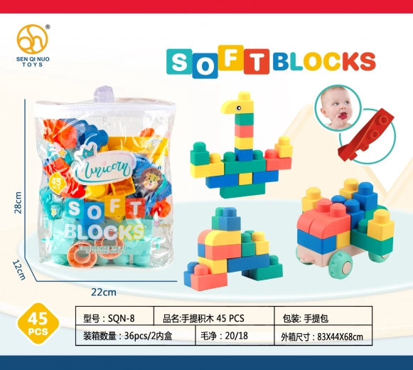 Dieses bunte Set aus weichen Bausteinen enthält 45 Teile für sicheres, förderndes Spiel. Das Material ist kinder- und umweltfreundlich, die Steine sind leicht, ohne scharfe Abschlüsse und kehren nach dem Biegen in ihre ursprüngliche Form zurück. Pflegeleicht – einfach abspülen oder auskochen, die Farben bleiben dauerhaft kräftig.