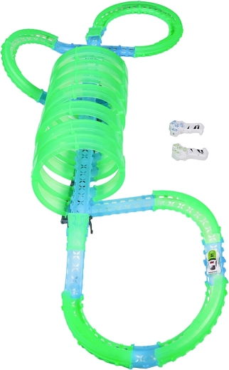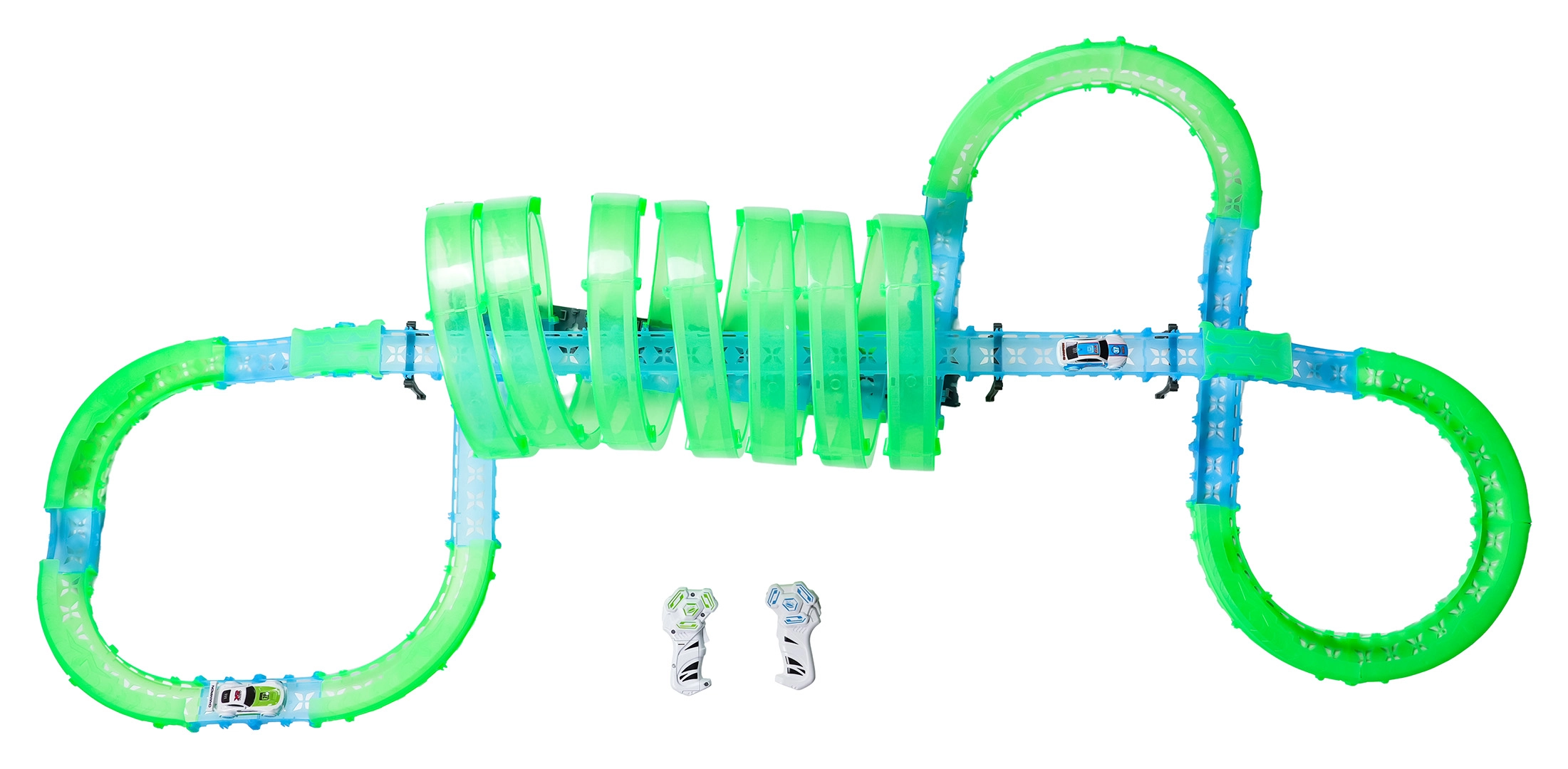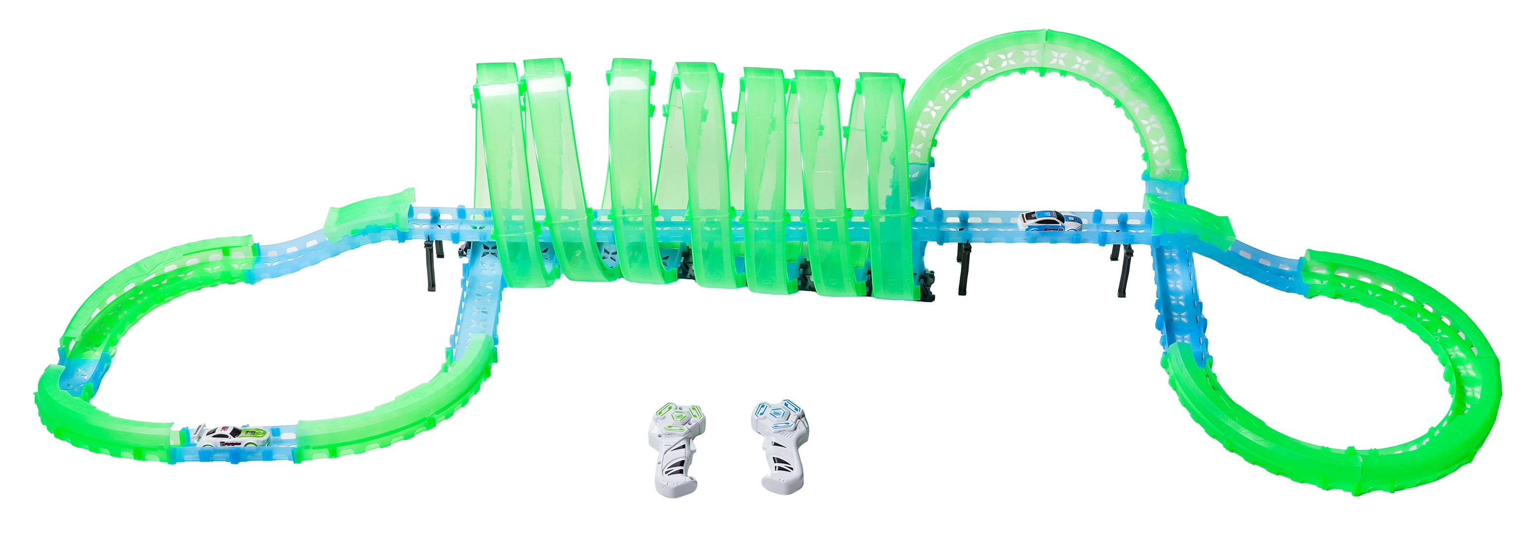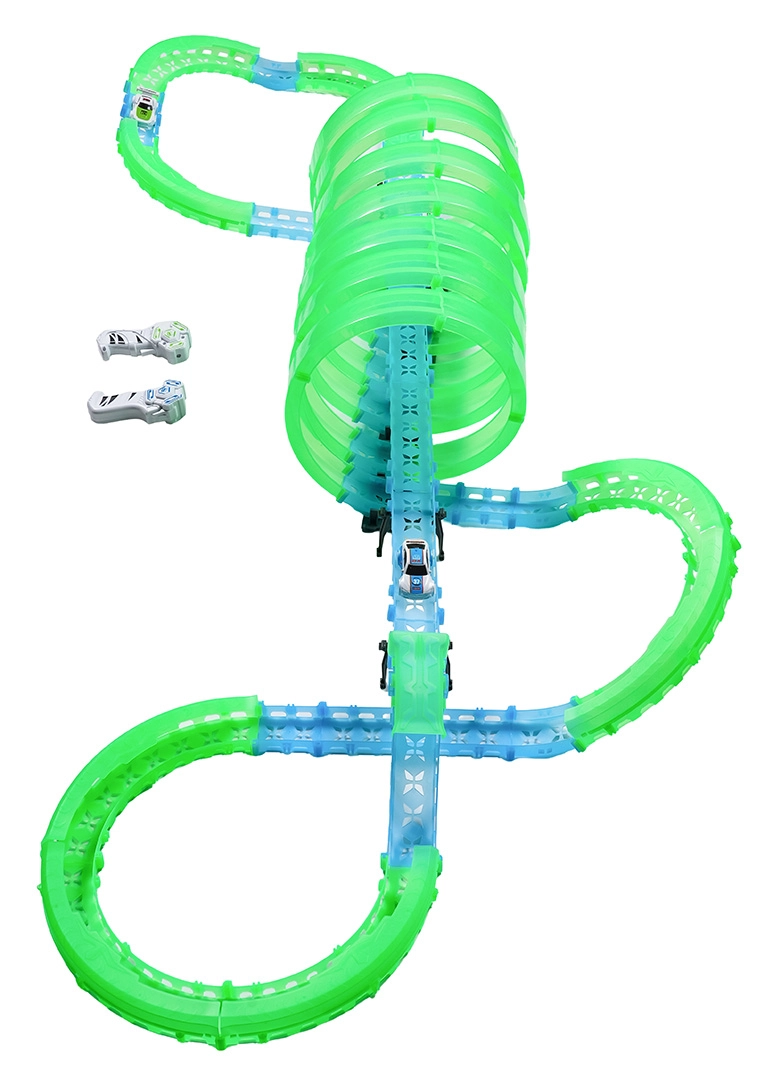 Diese modulare Rennstrecke aus lichtleitenden Teilen in Neon-Grün und Blau lässt sich leicht zusammenklicken und ermöglicht schnelle Umbauten. Das fluoreszierende Material strahlt nach dem Aufladen und verwandelt in Kombination mit den LED-Autos das Zimmer in eine fesselnde Lichtarena.