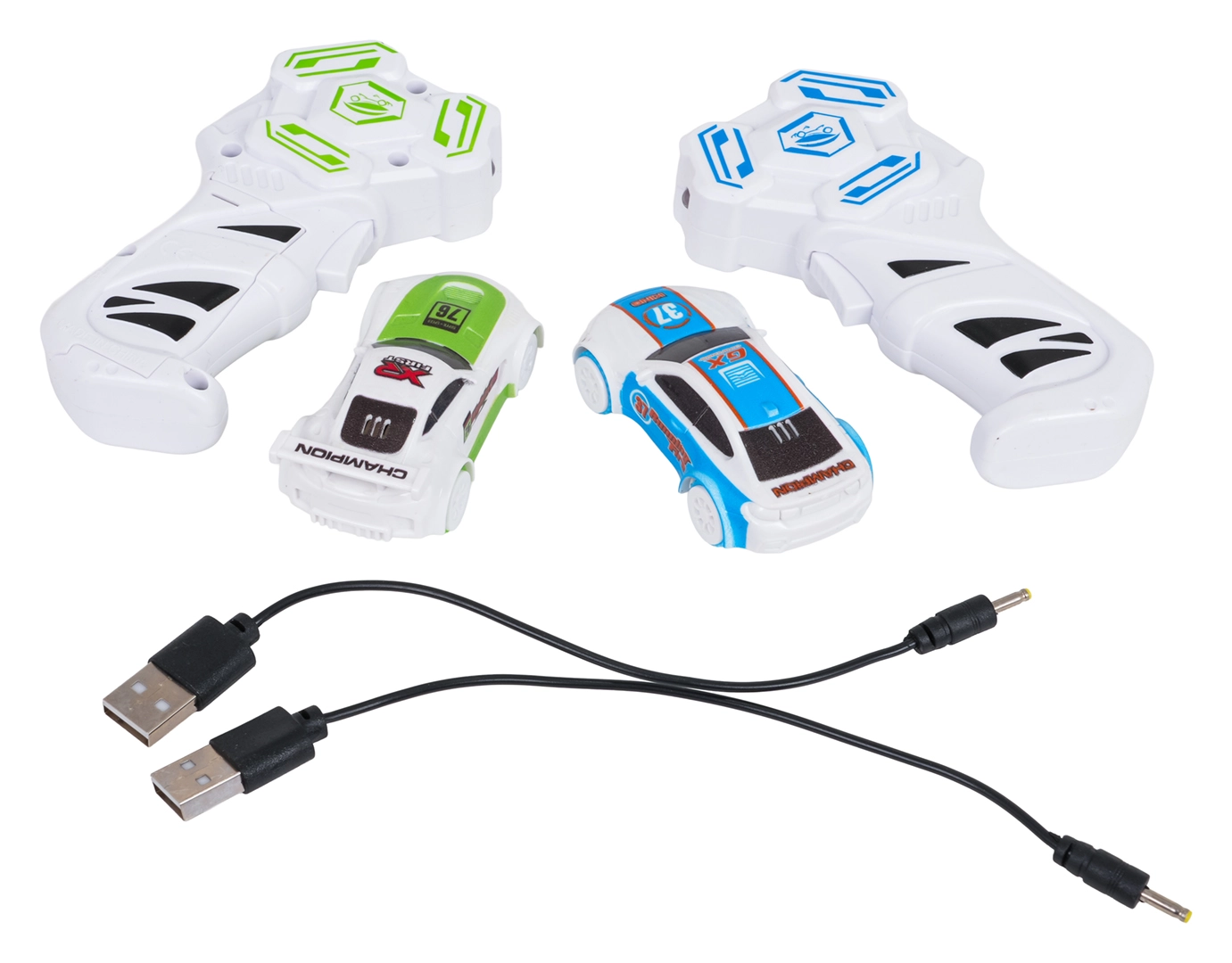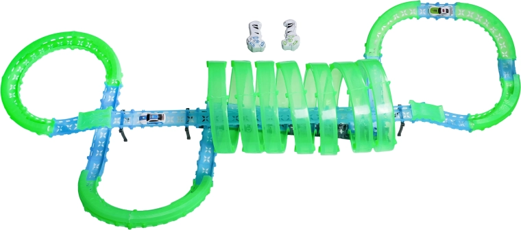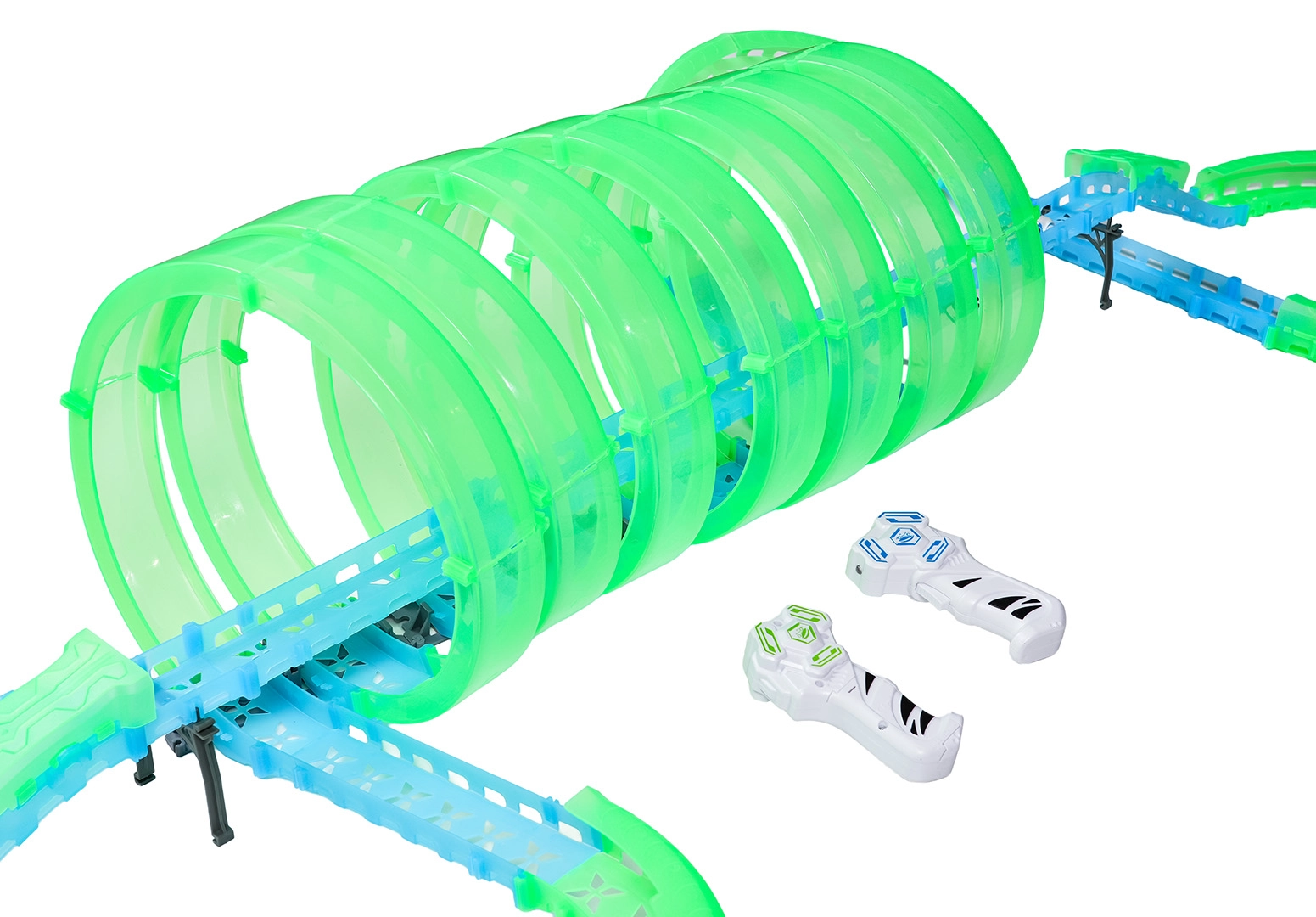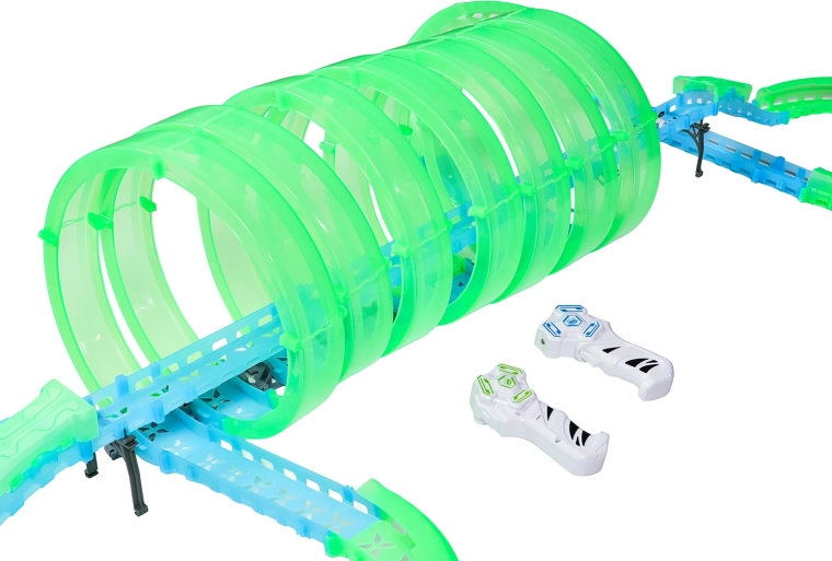 Enthalten sind zwei Hand-Controller für flotte Rennen zu zweit. Die Strecke umfasst mehrere 360°-Loopings, erhöhte Abschnitte und Tunnelsegmente für dynamische Fahrten und Stunts.