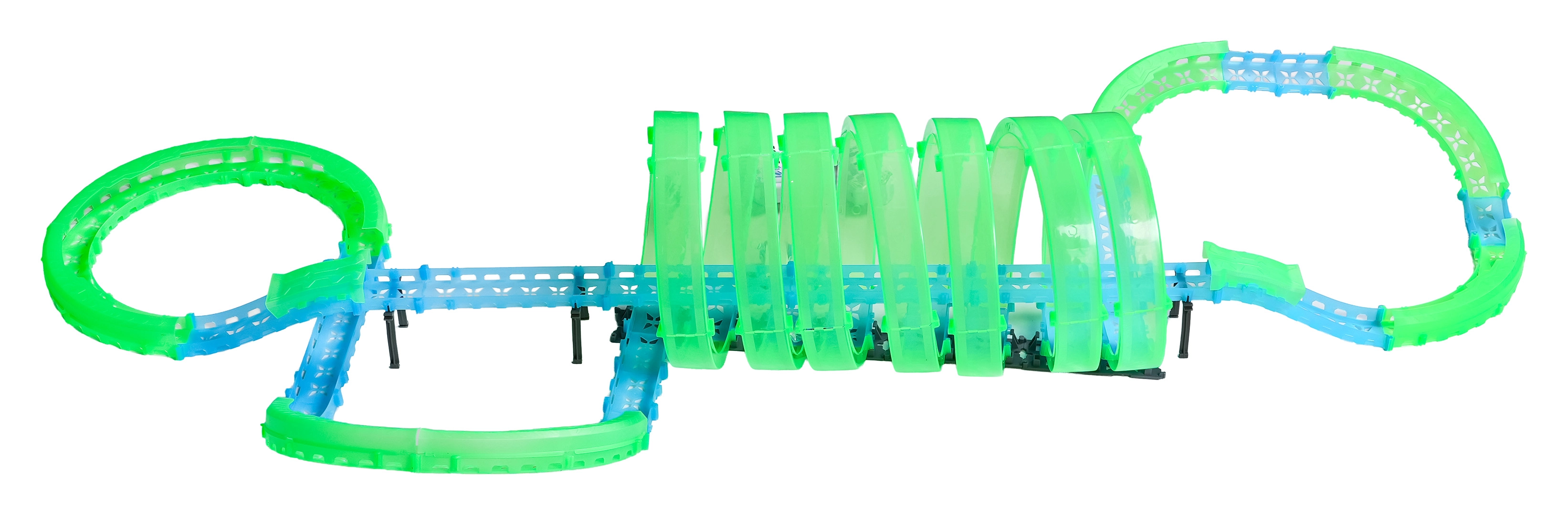 Die Strecke enthält mehrere 360°-Loopings, Spiralen und Brücken, die Tempo und Spaß bei jeder Fahrt steigern.