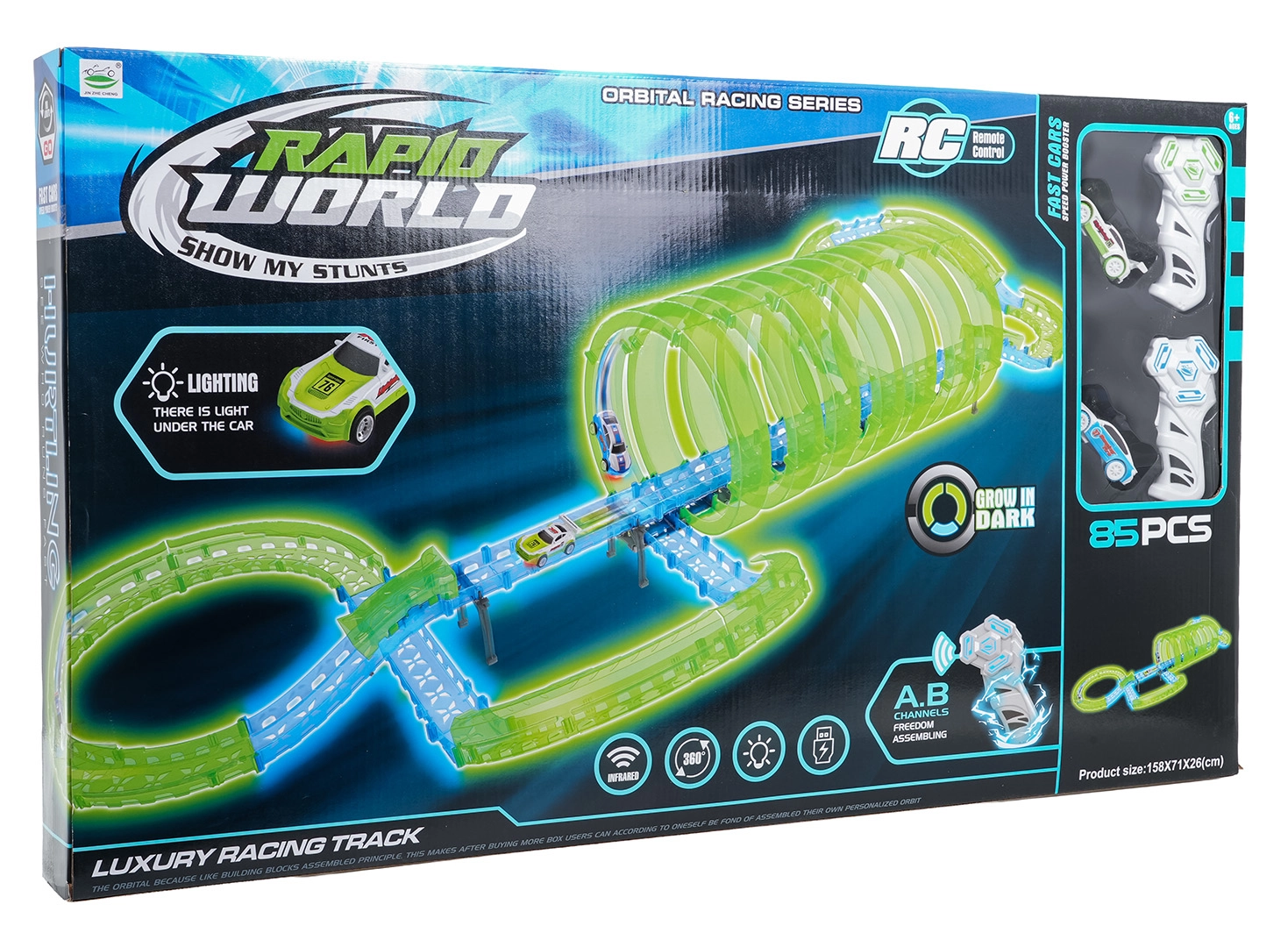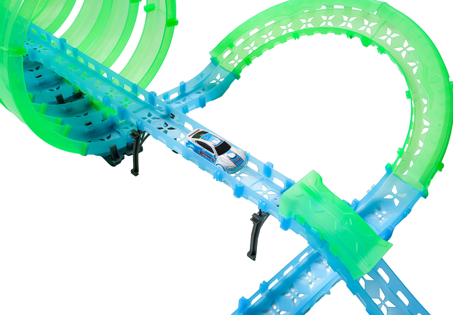 Fluoreszierende Streckenteile leuchten nach dem Aufladen mit Licht, und die LED-Beleuchtung der Autos hinterlässt während der Fahrt eine beeindruckende Lichtspur.