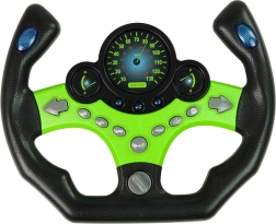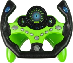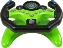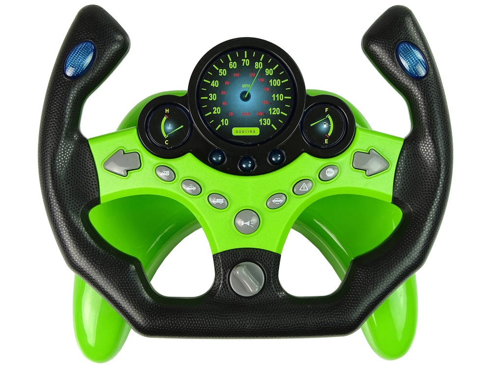 Dieses grün‑schwarze Kinderlenkrad bietet bis zu 9 Funktionstasten, darunter Blinker, Hupe und Geräusche der Einsatzkräfte. Nach dem Drehen des Schlüssels leuchten die blau hinterleuchteten Instrumente, und der kleine Fahrer kann auf die „Straße“ starten. Der stabile Sockel mit Saugnäpfen hält das Lenkrad fest auf der Tischplatte.