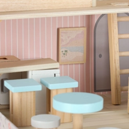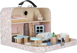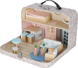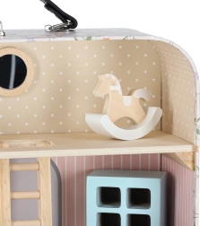 Dieses Mini-Puppenhaus im Koffer verwandelt sich nach dem Öffnen in ein zweistöckiges Interieur mit Küche, Wohnzimmer und Schlafzimmer. Zarte Pastellfarben in Kombination mit natürlichem Holz schaffen eine gemütliche Atmosphäre und laden zum Rollenspiel mit Puppen oder Figuren ein.