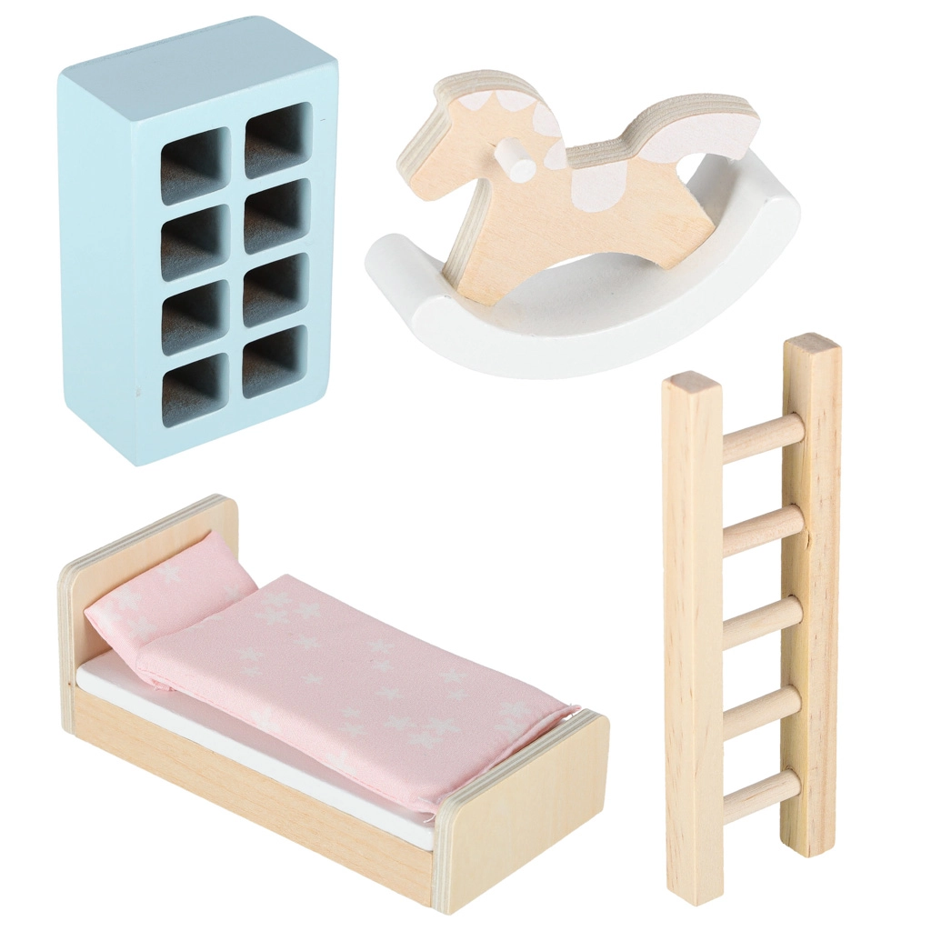 Zweigeschossiges Interieur mit umfangreicher Ausstattung – von Bett und Sofa bis hin zu Küchenzeile, Tischen, Hockern, Regalen und Pflanzen. Kinder können den Raum beliebig umgestalten und eigene Geschichten erfinden.