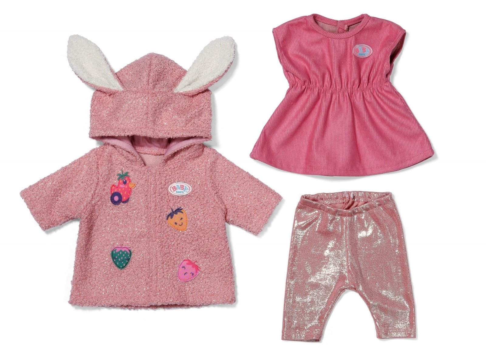 Verleihe der Garderobe deiner BABY born Puppe einen frischen Stil. Dieses Komplett-Set kombiniert ein weiches, flauschiges Jäckchen mit niedlichen Applikationen, ein rosa Kleid und glänzende Leggings – alles aufeinander abgestimmt in trendigen Rosatönen. Das Outfit ist für einfaches An- und Ausziehen gestaltet, damit Kinder realitätsnahes Spielen bei Alltagsabenteuern und festlichen Momenten genießen können.