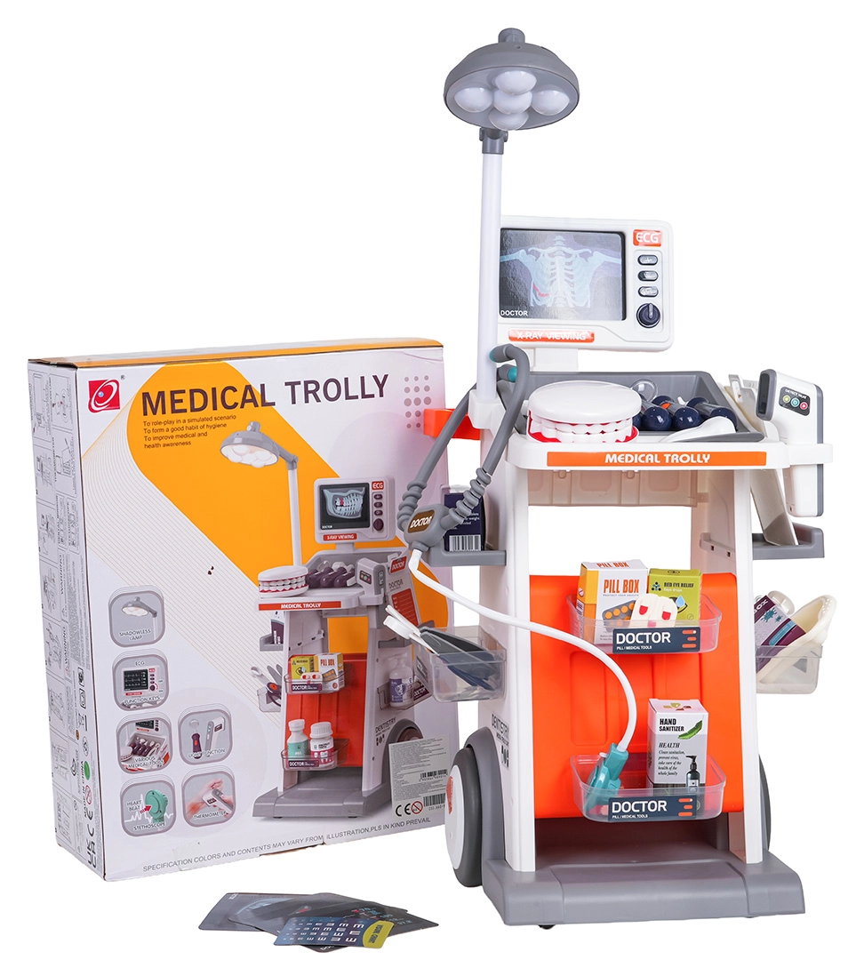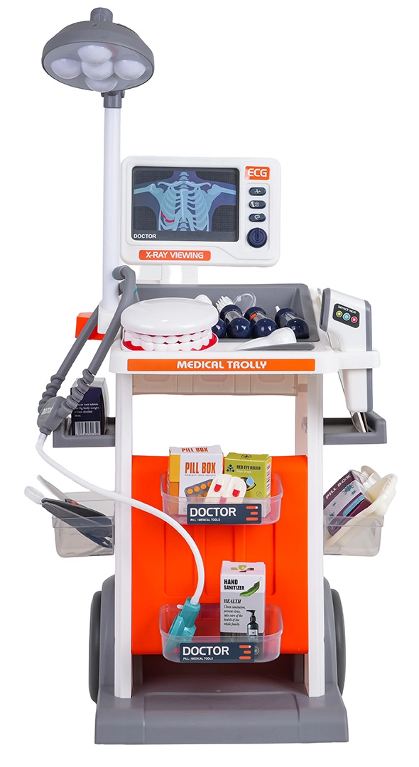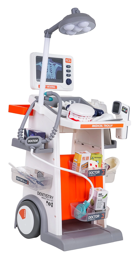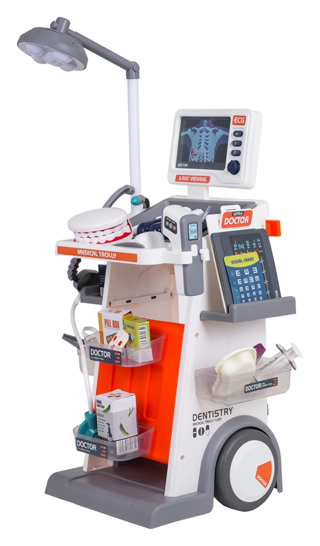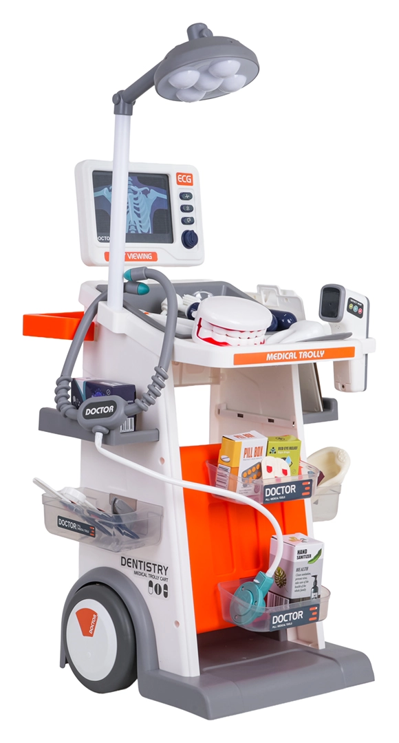 Dieses reichhaltige Set vereint medizinische, zahnärztliche und augenärztliche Hilfsmittel in einem mobilen Wagen. Große Räder und ein Griff ermöglichen einfaches Bewegen, während Ablagen und Behälter sämtliches Zubehör aufnehmen. Kinder genießen ein realistisches Spiel dank Licht- und Soundeffekten – Lampe, Panel mit „Röntgen“-Ansichten, beleuchtetem Thermometer und Dentalspiegel sowie Herzschlag im Stethoskop.