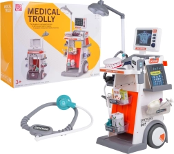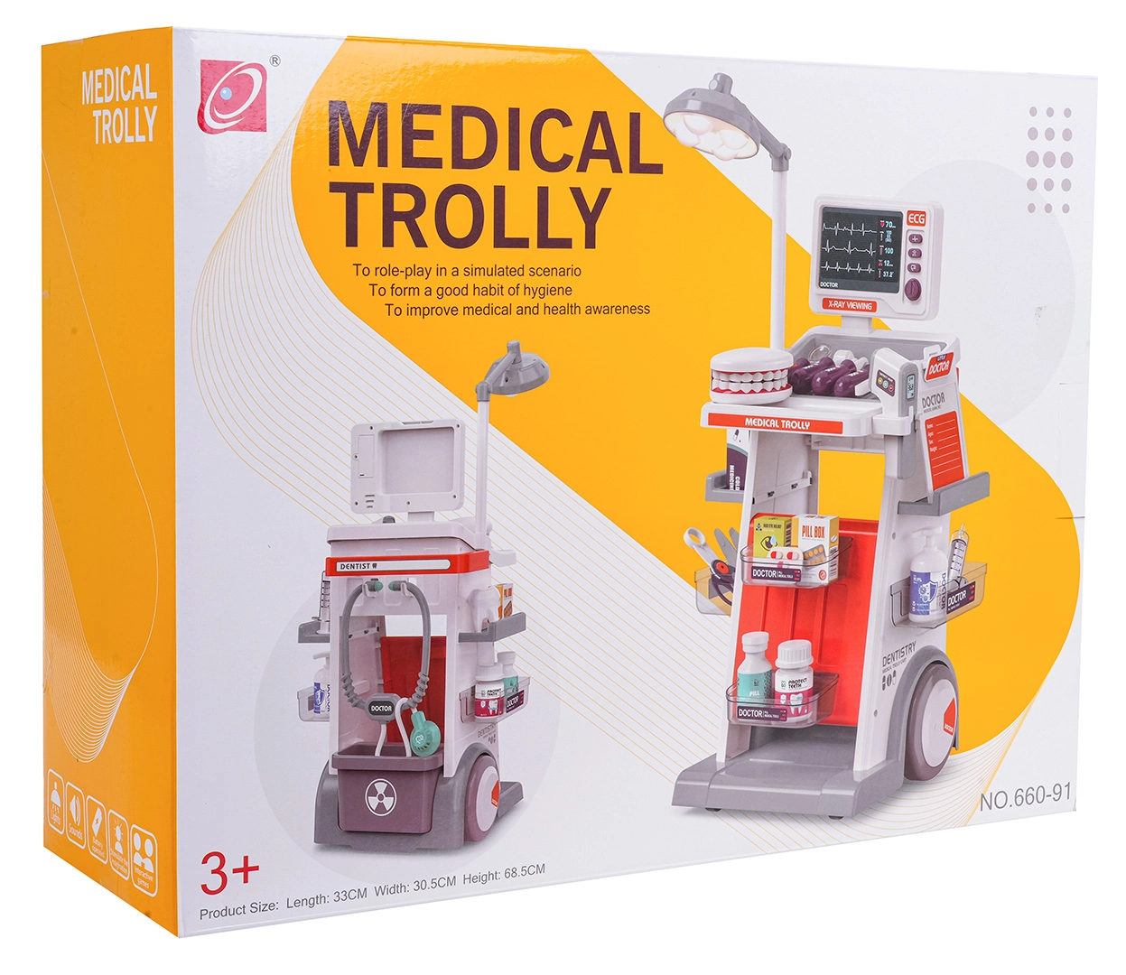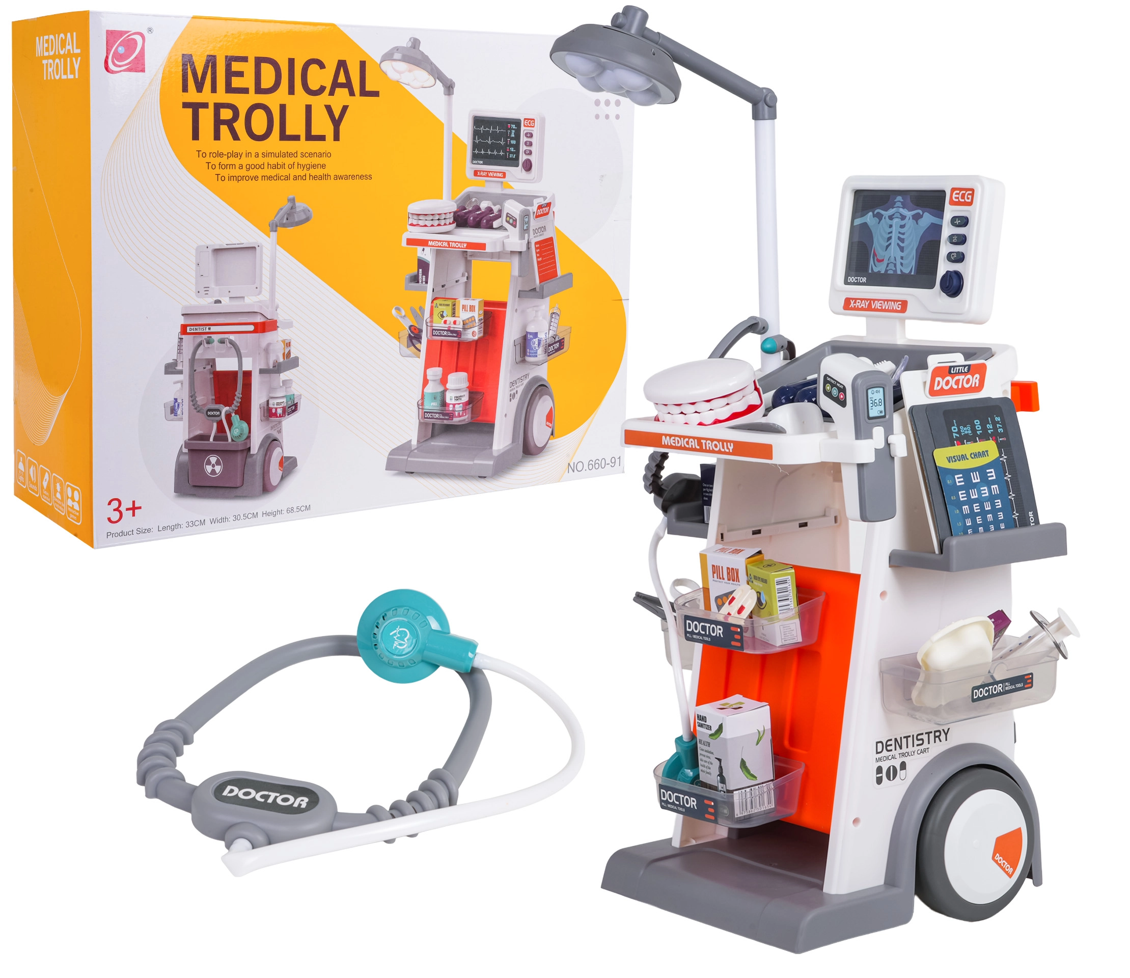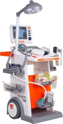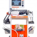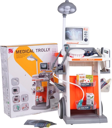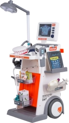 Dieses reichhaltige Set vereint medizinische, zahnärztliche und augenärztliche Hilfsmittel in einem mobilen Wagen. Große Räder und ein Griff ermöglichen einfaches Bewegen, während Ablagen und Behälter sämtliches Zubehör aufnehmen. Kinder genießen ein realistisches Spiel dank Licht- und Soundeffekten – Lampe, Panel mit „Röntgen“-Ansichten, beleuchtetem Thermometer und Dentalspiegel sowie Herzschlag im Stethoskop.