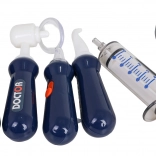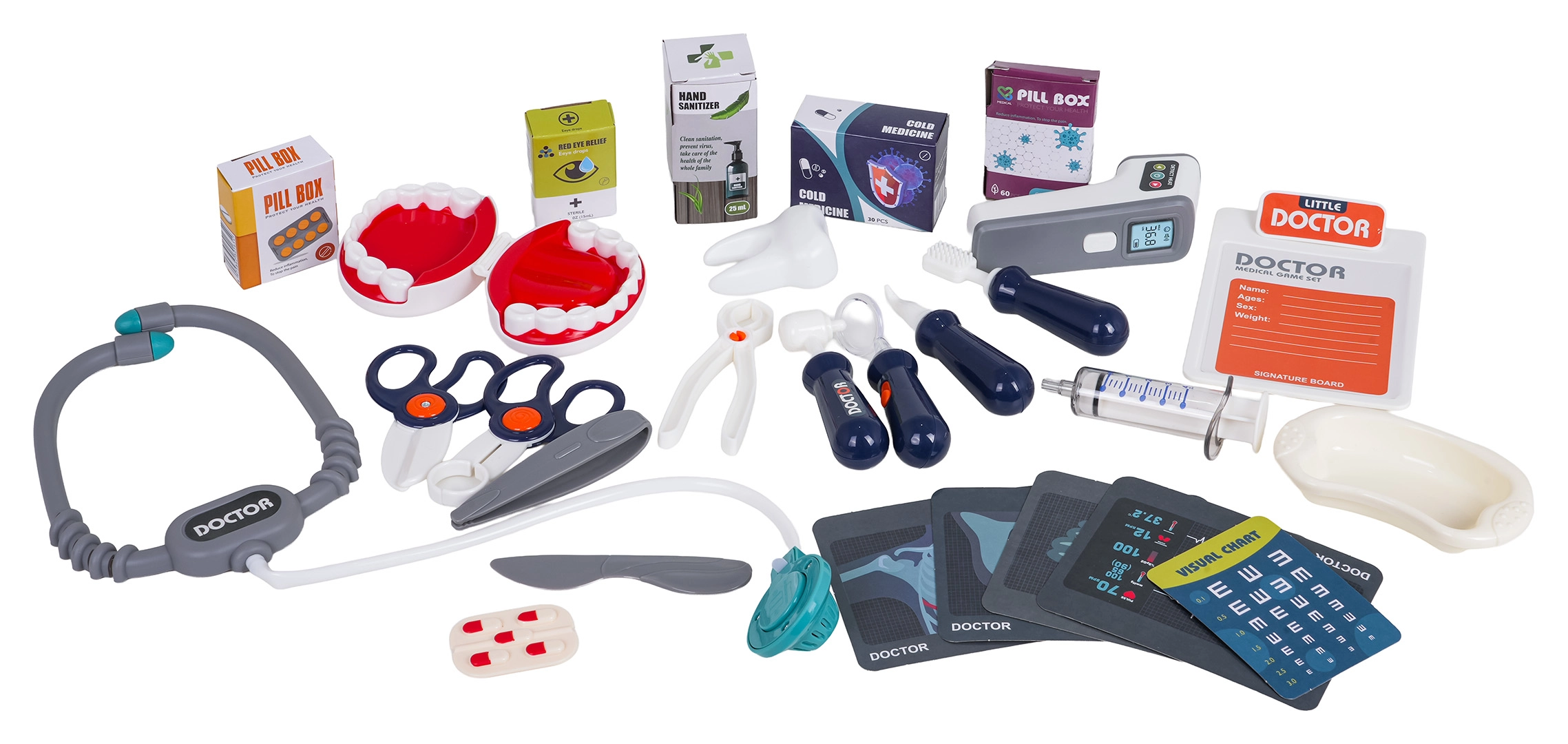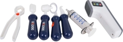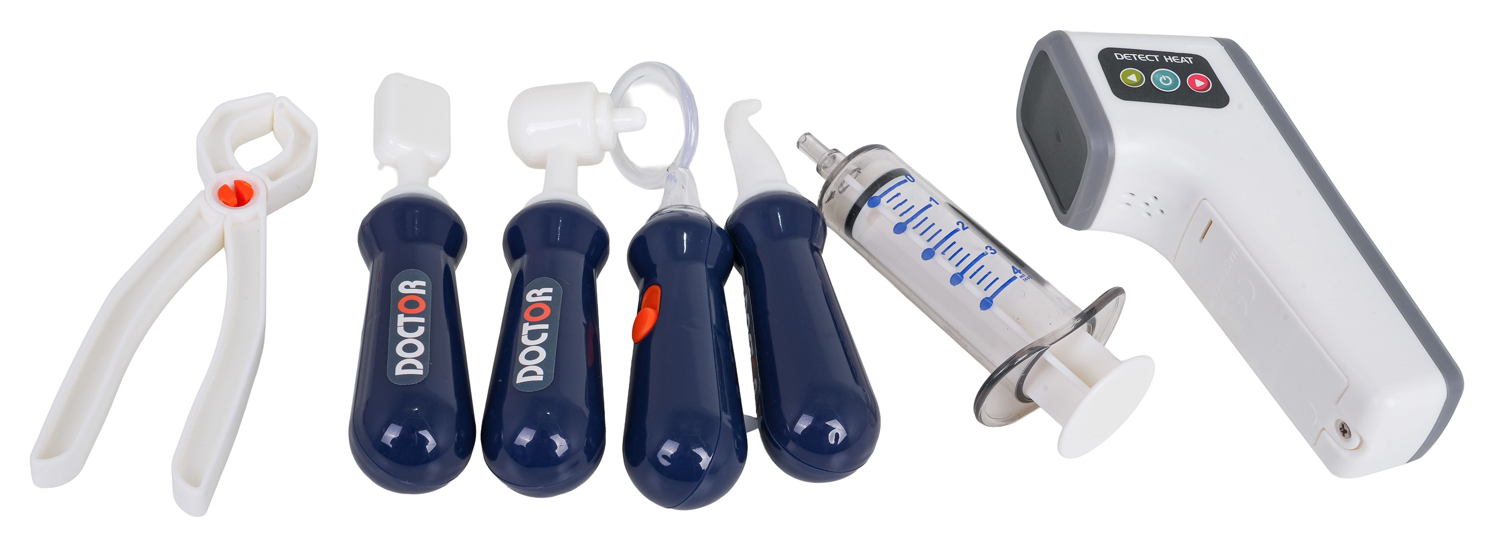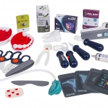Stethoskop, Thermometer, Spritze, Pinzette, Schere, dentale Werkzeuge, „Röntgen“-Karten, Zahnmodell, Patientenkarte und weiteres Zubehör.