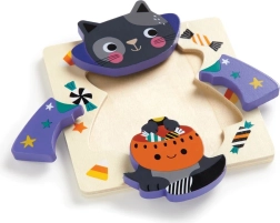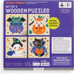 Das Set enthält vier einzelne Holzpuzzles mit sanften Halloween-Illustrationen von Wendy Kendall. Jedes Puzzle hat eine glatte Holzgrundplatte mit einer bemalten Szene, in die Kinder die großen Teile leicht einsetzen können. Ideal als erstes Puzzle – sicher, übersichtlich und unterhaltsam.