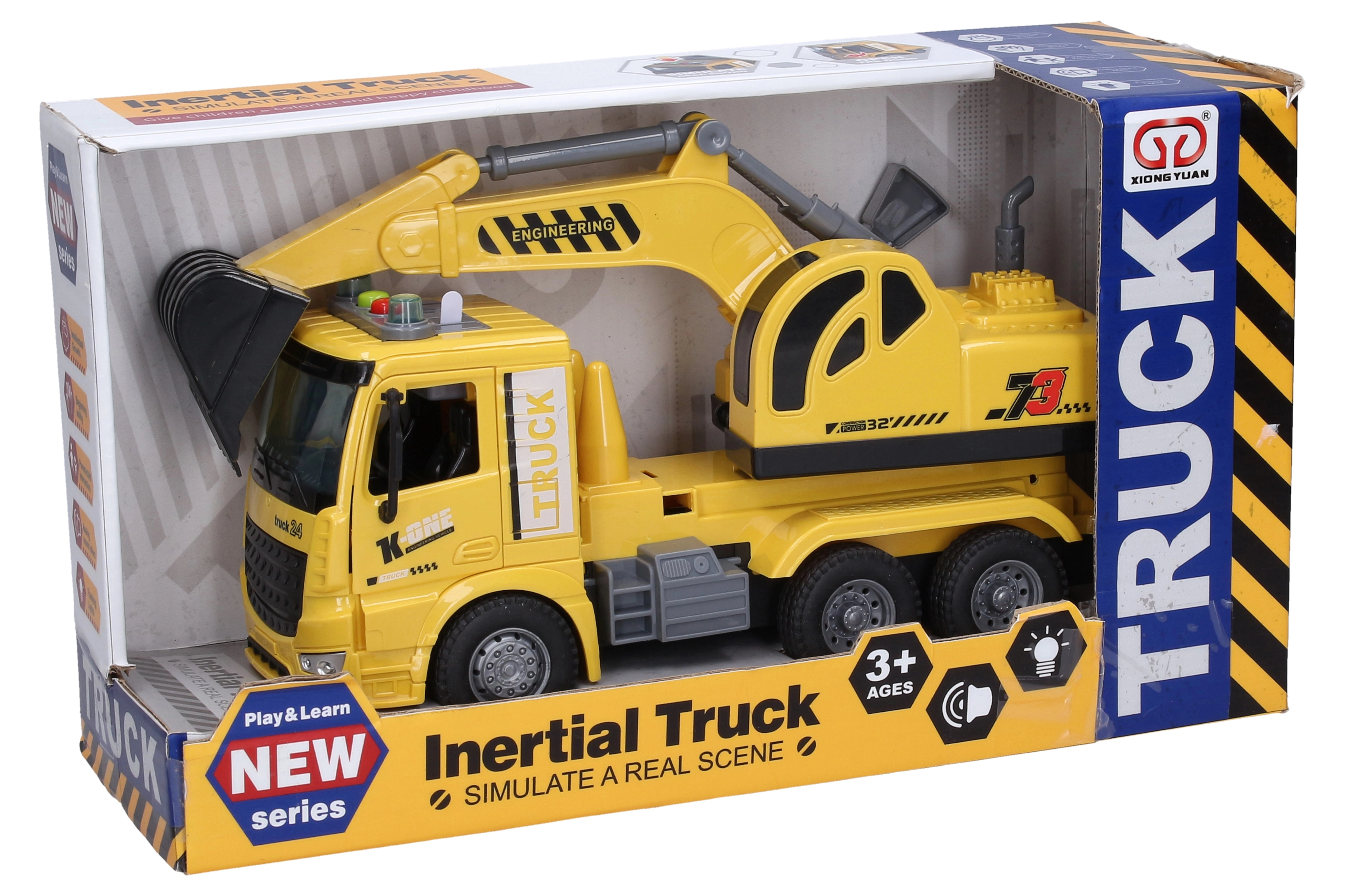 Dieser detailreich gestaltete Bagger mit einer Länge von 28 cm ist das ideale Spielzeug für alle kleinen Fans von Baufahrzeugen. Der Schwungrad-Antrieb sorgt für eine gleichmäßige Fahrt, während die Tasten auf dem Dach realistische Motor-, Grab-, Rückfahr- und Hupgeräusche mit Lichteffekten aktivieren.