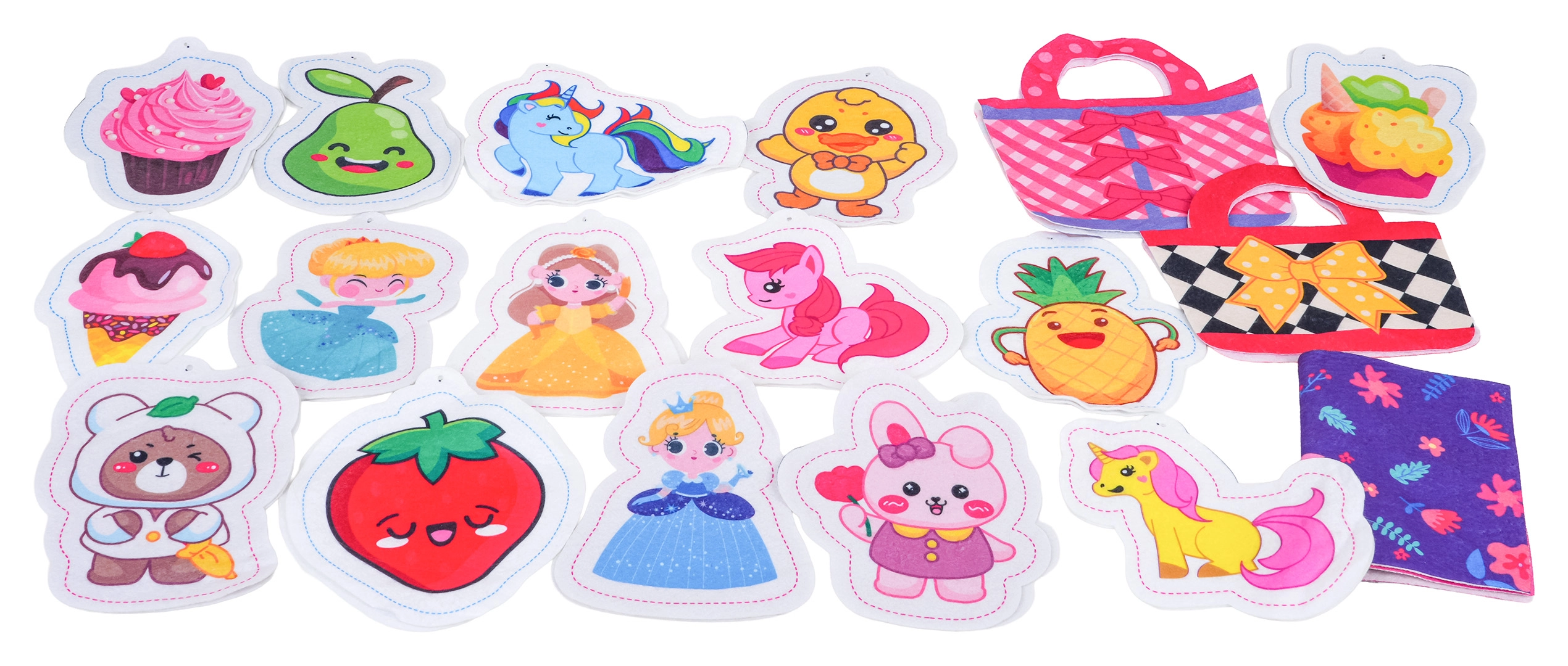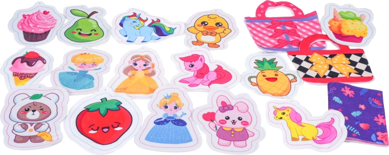 Zum Set gehören Filz-Vorlagen für Täschchen, Textilteile, Schablonen zur Herstellung plüschiger Deko, Füllmaterial, Kugelketten und eine Schere – alles, was Kinder zur Herstellung eigener Accessoires und niedlicher Anhänger benötigen. Das Spiel fördert Koordinationsfähigkeiten, Geduld und Kreativität.