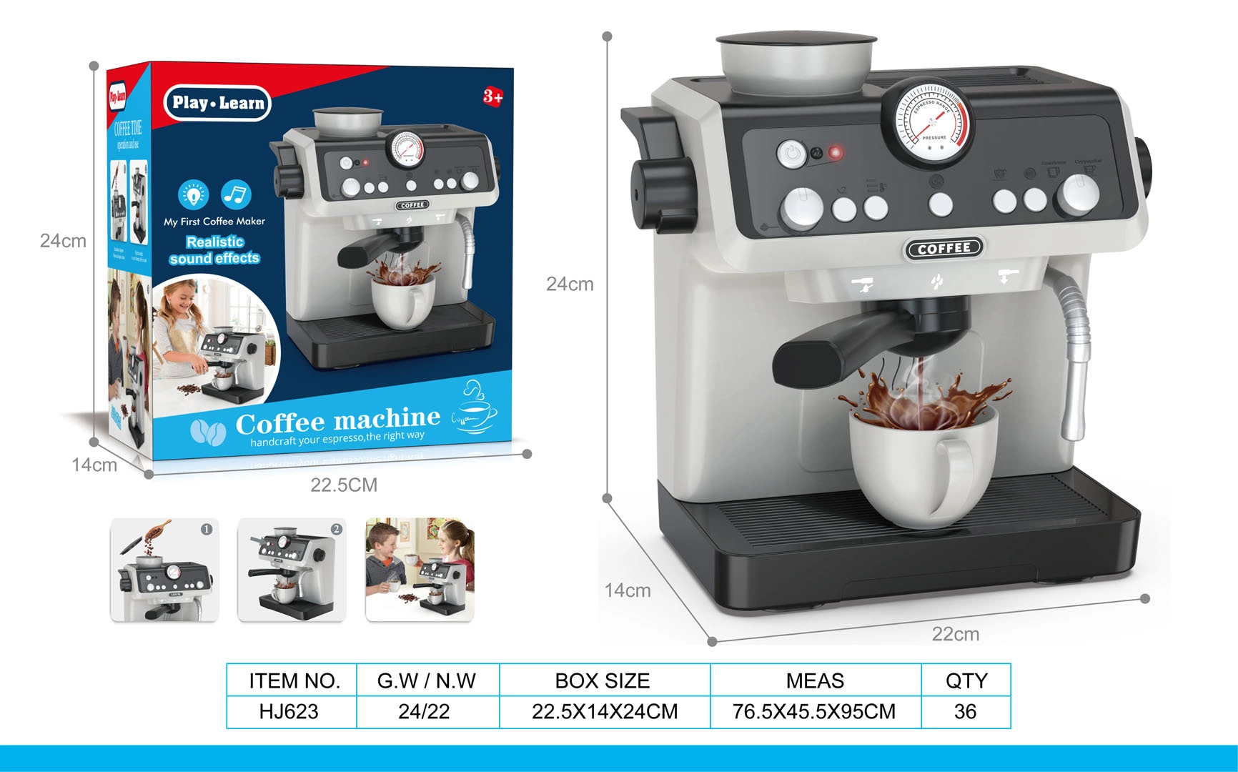 Das Spielzeug ist ideal für Kinder ab 3 Jahren und unterstützt ihre Kreativität in der sicheren Umgebung eines heimischen Cafés. Die Bedienelemente umfassen einen beweglichen Hebel, einen öffnenden Wassertank und Imitationen von Kaffeeauswahl-Wählern, die den Eindruck einer echten Kaffeemaschine verstärken.