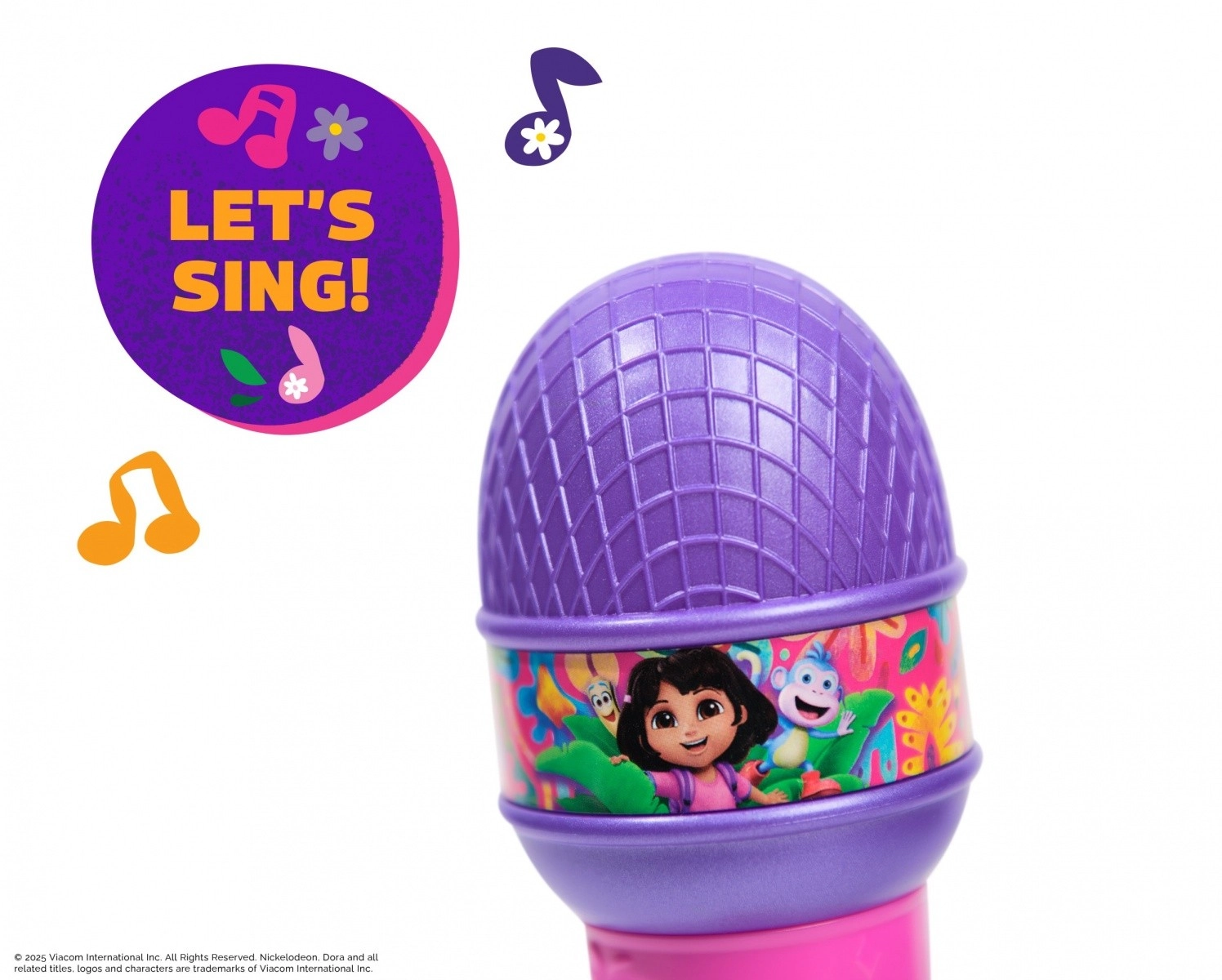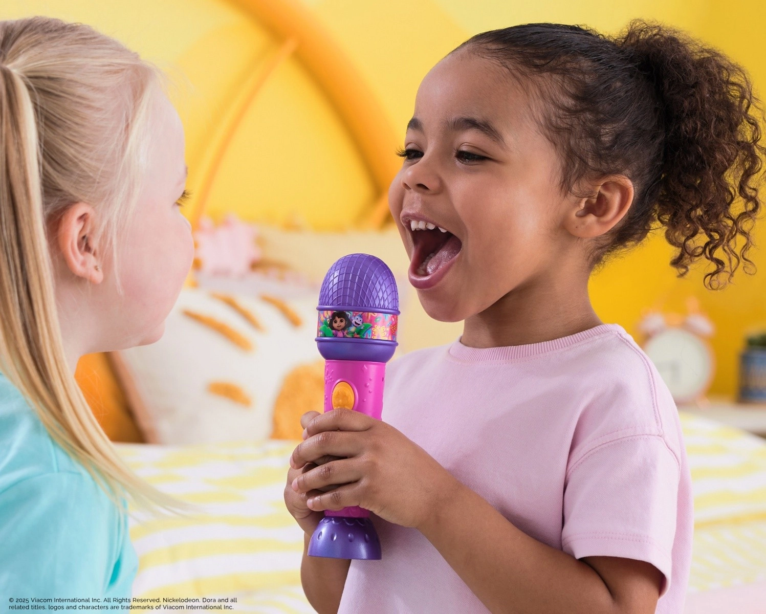 Das Mikrofon mit Effekten DORA ist die perfekte Wahl für kleine Sängerinnen und Sänger sowie Fans der beliebten Heldin. Mit nur einem Knopfdruck starten Kinder bekannte Hits wie „We Did It“ oder „Todo Juntos“ oder hören fröhliche Sprüche, zum Beispiel „That's banana-riffic!“. Die kompakte Größe (19,5 cm) liegt hervorragend in der Hand und fördert die natürliche kindliche Kreativität.