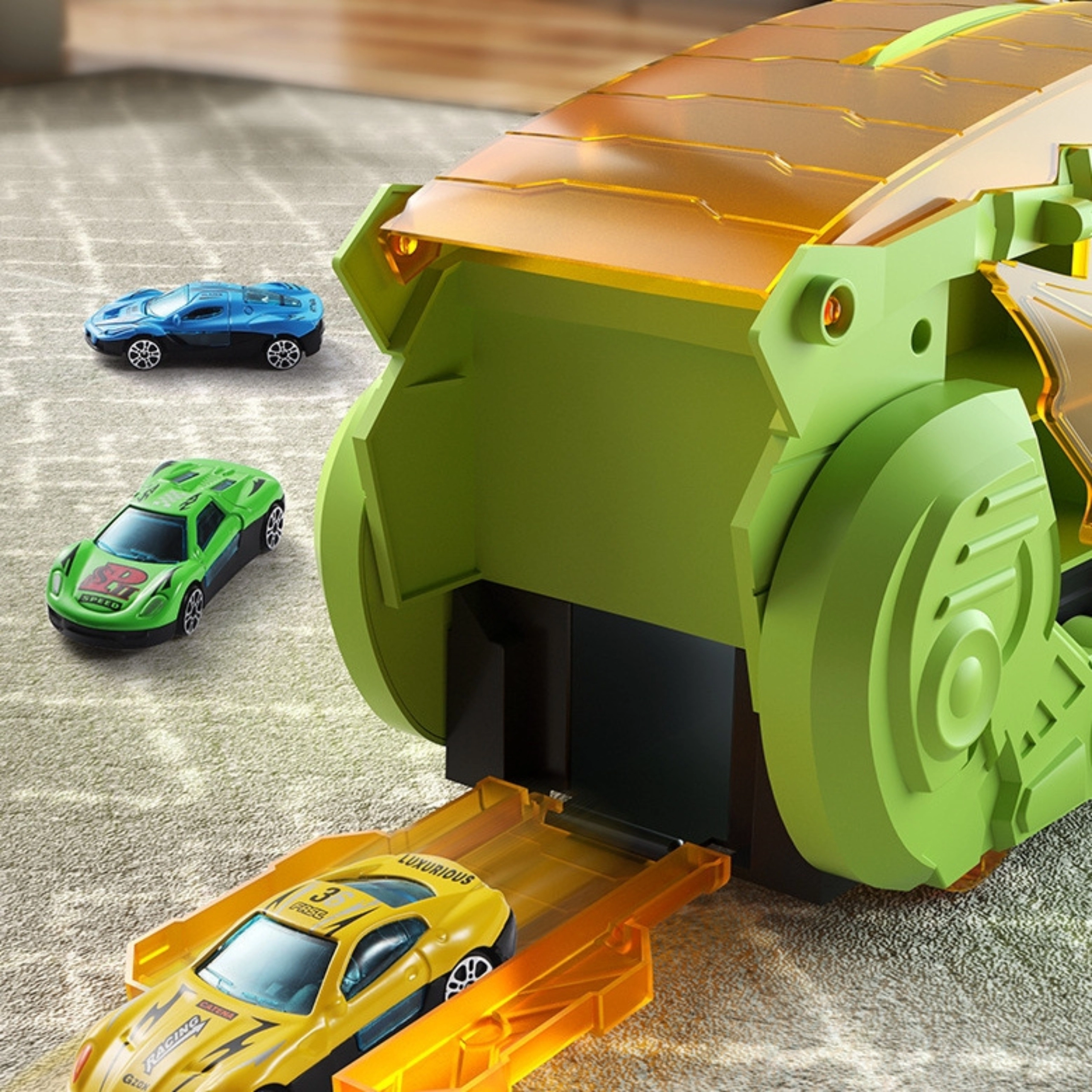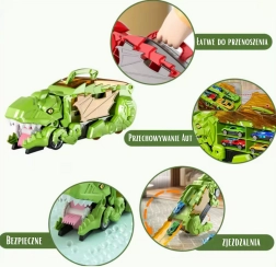Der Dinosaurier-Sattelzug verwandelt sich im Handumdrehen in einen Action-Spielplatz: Klappen Sie die orange Rampe aus, laden Sie die Autos auf und lassen Sie sie aus dem geöffneten Dinosauriermaul starten. Dank des praktischen Tragegriffs und der inneren Fächer verstauen Sie alle Fahrzeuge mühelos und nehmen sie überallhin mit. Kräftige Farben und markante Details fördern die Fantasie und laden zum Spielen ein.
