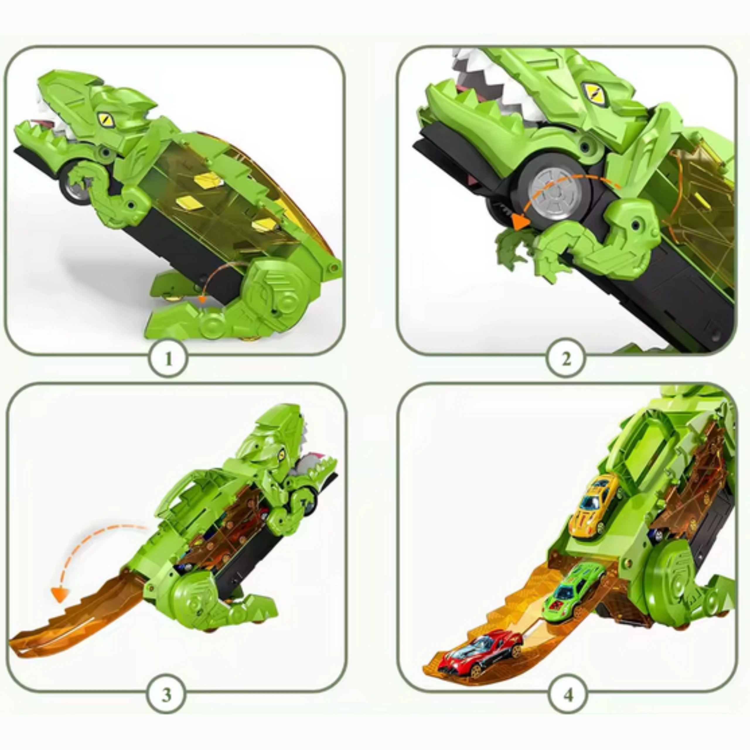 Öffnen Sie den Dinosaurierkopf und lassen Sie die orange Rutschbahn herunter. Die Autos rollen sanft hinaus und das Rennen kann beginnen.