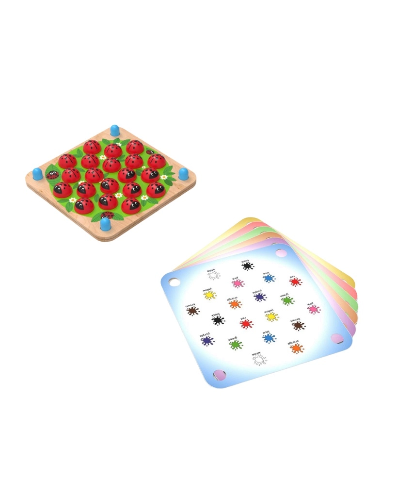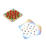 Dieses außergewöhnliche Multi-Memory kombiniert das beliebte Gedächtnisspiel mit 3D-Elementen. Eine der sechs doppelseitigen Vorlagen wird zwischen zwei Holzplatten geschoben, die Bilder werden mit Marienkäfern abgedeckt und das Spiel kann beginnen. Kinder trainieren Gedächtnis, logisches Denken, Hand-Auge-Koordination und Wortschatz – spielerisch und auf natürliche Weise.