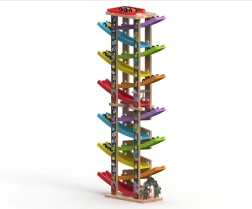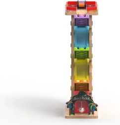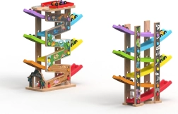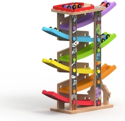 Dieser vertikale hölzerne Renn-Turm mit 6 farbigen Rampen bietet dynamischen, schwerkraftbasierten Spielspaß. Kinder setzen das Auto oben auf und beobachten, wie es über die einzelnen Ebenen, Kurven und Brücken nach unten saust. Dank der stabilen Konstruktion und der kompakten Maße passt die Bahn ins Kinderzimmer oder Spielzimmer und hält auch intensiver Nutzung stand.