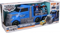 • Komplettes Set – LKW–Basis, 2 Autoroboter, Rampe und Verkehrszeichen.