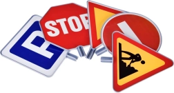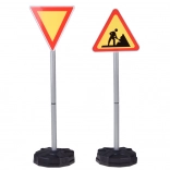 Einfache Steckmontage aus Rohren und Verbindern. Im Set sind fünf beliebte Schilder enthalten: STOP, Vorfahrt gewähren, Parkplatz, Einfahrt verboten und Baustelle.