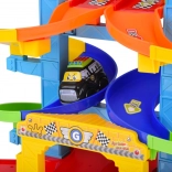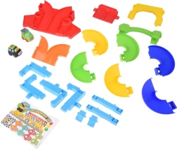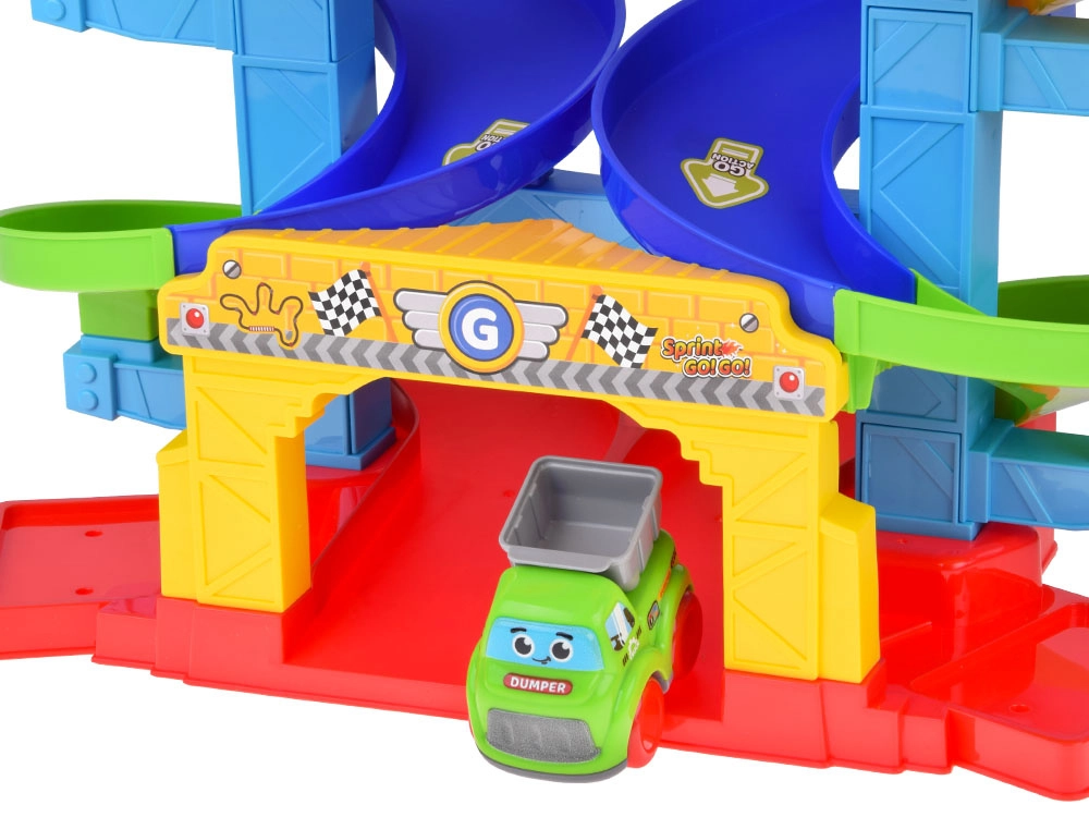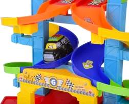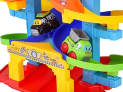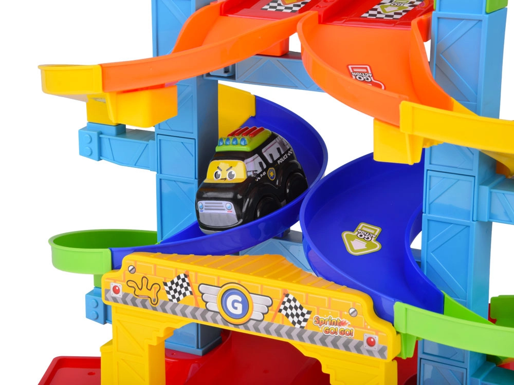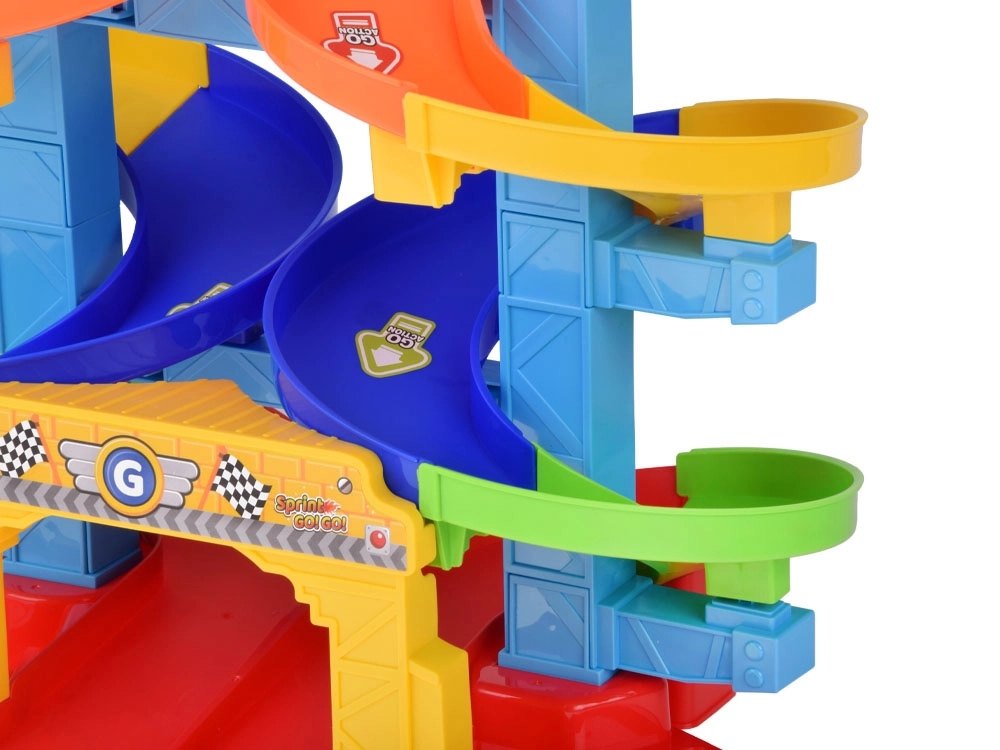 Bunte, gewundene Strecken führen die Autos sicher nach unten. Stabile Stützen und breite Seitenbegrenzungen sorgen für eine gleichmäßige Fahrt ohne Hängenbleiben.