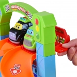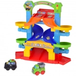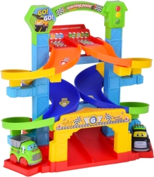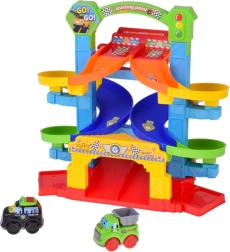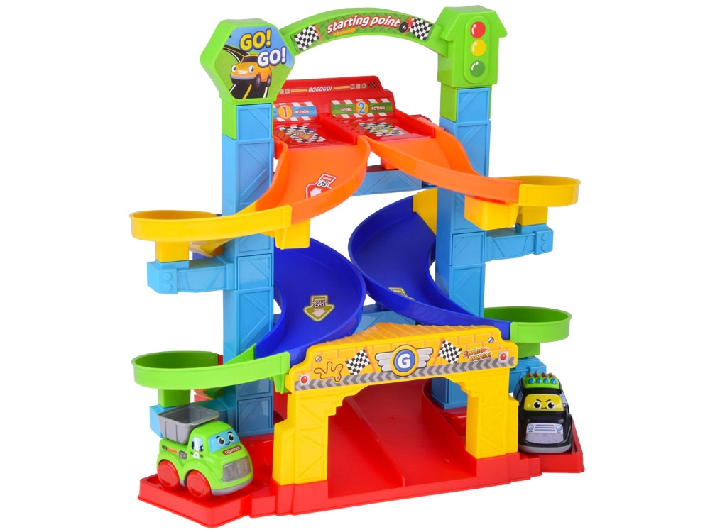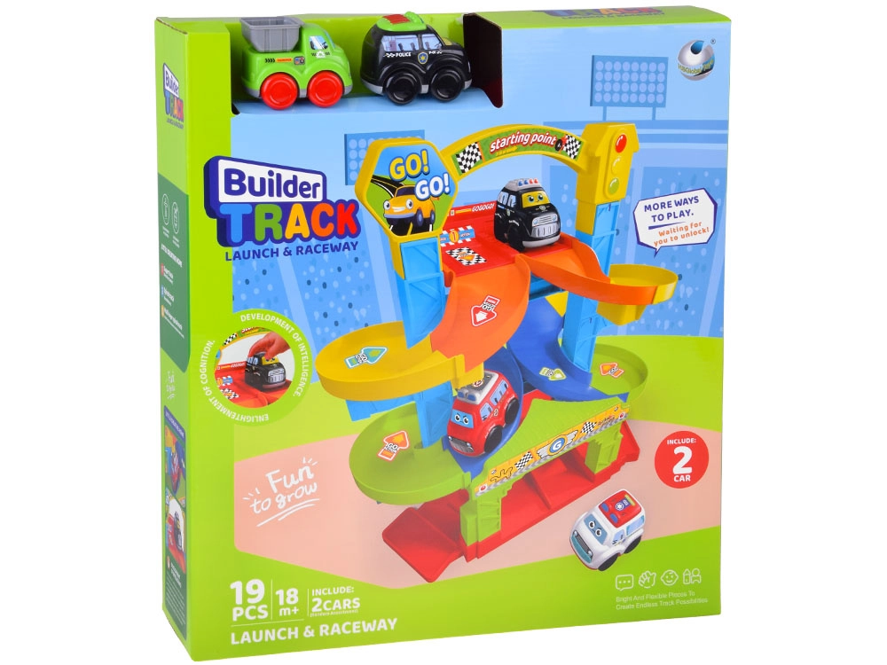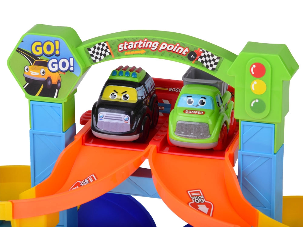 Diese spiralförmige Autorennbahn ist eine großartige Wahl für die ersten Rennen kleiner Fahrer. Bunte Spiralstrecken, ein Starttor und stabile Pfeiler sorgen für eine gleichmäßige Fahrt der Autos von oben nach unten. Beim Spielen trainieren Kinder die Hand-Auge-Koordination, entwickeln Logik und Vorstellungskraft und lernen gleichzeitig die Prinzipien von Ursache und Wirkung.