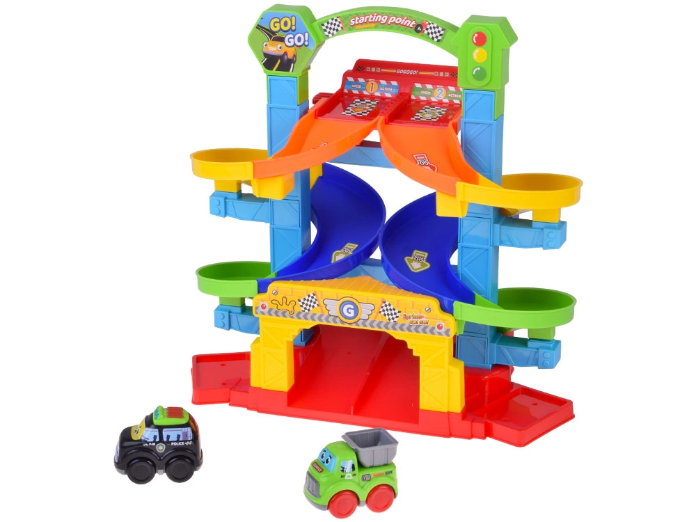 Bunte, spiralförmige Autorennbahn mit mehreren Ebenen und zwei niedlichen Autos bietet stundenlangen Spaß und fördert die Entwicklung. Dank der einfachen Montage und der sicheren Ausführung genießen Kinder es, den Autos beim Flitzen über die gewundenen Rampen zuzusehen. Enthalten sind 2 Fahrzeuge (Polizei und Kipplaster), ein mehrstöckiger Drehabfahrtsturm, ein Starttor und eine robuste Kunststoffkonstruktion, ideal bereits ab 18 Monaten.
